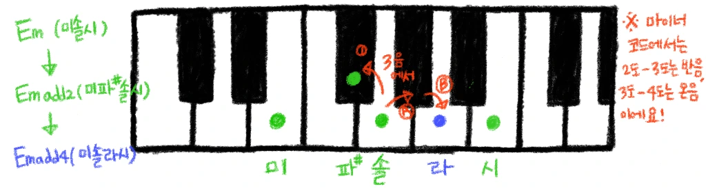 저 같은 경우는 아직도 마이너 코드에서와 메이저 코드에서 제가 원하는 코드를 만들 때 음과 음 사이의 간격을 헷갈리곤 합니다. 제 글을 보시는 분 중에서도 그런 고난(?)을 겪으시는 분을 위해 마이너 코드일 때 만드는 법을 참고로 넣어두려 합니다. 아래 그림으로 그리겠지만 내용을 미리 설명드리면 메이저 코드에서는 2음을 찾을 때 3음에서 2칸을 (온음) 내려서 만들고, 마이너 코드에서는 3음에서 1칸을 (반음) 내려서 2음을 찾습니다. 3음은 원래 그 코드의 가운데 음이니까 쉽게 찾을 수 있으시겠죠?