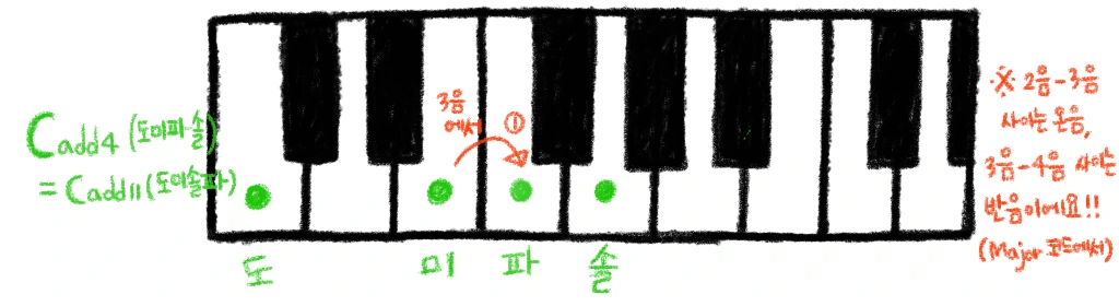 Add2 코드는 이해가 잘 되셨나요? 그다음으로는 Add4 코드를 만들어보겠습니다. 이 또한 크게 어려운 것은 없을 것으로 생각됩니다. 간단히 4음만 더하면 되니까요. 이제 우리 이 정도는 간단히 할 수 있잖아요? 마이너한 조를 가지는 노래에서는 11 코드도 많이 쓰인다고 합니다. 이 경우도 아래 그림을 넣을게요! 뒤에서도 얘기하겠지만 사이가 온음인지, 반음인지 잘 생각하면서 만드셔야 해요.