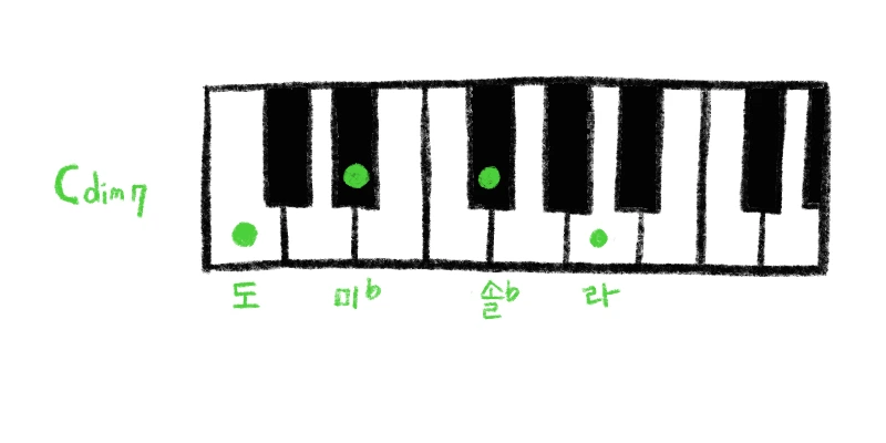 간단하게 결론부터 얘기하면 Cdim 코드에 7음을 붙인 코드입니다. 하지만 그동안 저희가 7 코드를 만들 때 붙였던 ‘장 7음’이나 ‘단 7음’이 아닌 ‘감 7음’을 붙여야 하는데요. 디미니쉬 코드는 그 이름만큼 계속 줄어든 = 짧은 음을 붙인다고 생각하시면 외우기에도 편하시지 않을까 싶습니다.