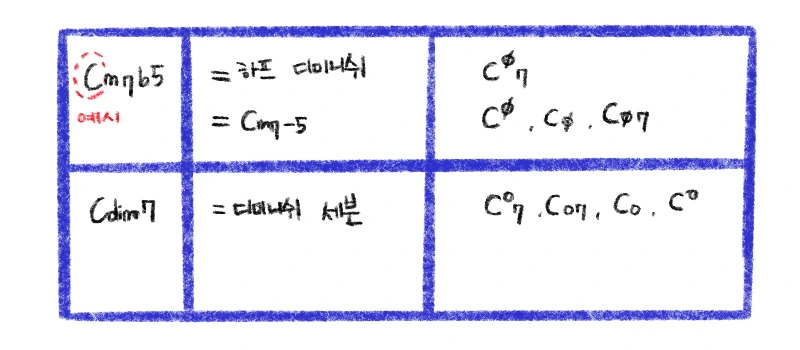 이제 마지막 내용입니다. 오늘 배우고 있는 이 코드들을 공부하다 보면 어디선가 ‘하프 디미니쉬’라는 단어를 보실 수 있을 텐데요. 갑자기 이게 또 무슨 용어인가 싶고 그렇습니다. 그래서 오늘의 글에서는 이 부분까지 설명하려고 합니다.