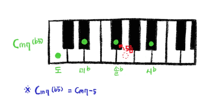 당연하다면 당연할 수 있지만 마이너 세븐 플랫 파이브 코드는 마이너 세븐 코드를 변형시킨 코드입니다. 그전에 우리는 마이너 코드도 배우고 세븐 코드를 만드는 법도 배웠으니 마이너 세븐 코드는 이제 쉽게 만드실 수 있으시겠죠? (마이너 세븐 코드와 다른 세븐 코드 만드는 법이 기억이 안 나신다면 이 매거진의 다섯 번째 편을 보시면 다시 기억이 나실 거예요.) 제가 반복적으로 자꾸 언급하게 되지만 이름에서 오는 느낌처럼 마이너 세븐 플랫 파이브는 마이너 세븐 코드에서 5번째 음을 ‘플랫’, 다시 말해서 반음을 내리면 되는 코드입니다. 거창한 긴 이름에 비해서 내용은 간단하죠? 어렵지 않습니다! 아래에 Cm7b5 코드를 예시로 넣어둘 테니 참조해주세요^^ 그림처럼 제5음을 반음만 내리면 됩니다. 그로 인해 근음, 3음, 5음이 디미니쉬 코드와 같은 배열로 변하게 되죠!