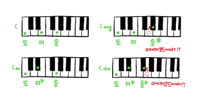 앞에서 얘기한 단어의 뜻대로 지난번의 diminish 코드와는 반대로 코드의 5음을 반음 늘려서 만드는 코드입니다. 아래 그림으로 코드를 비교하며 총 정리 느낌으로 정리해드릴 테니 참고해주세요.