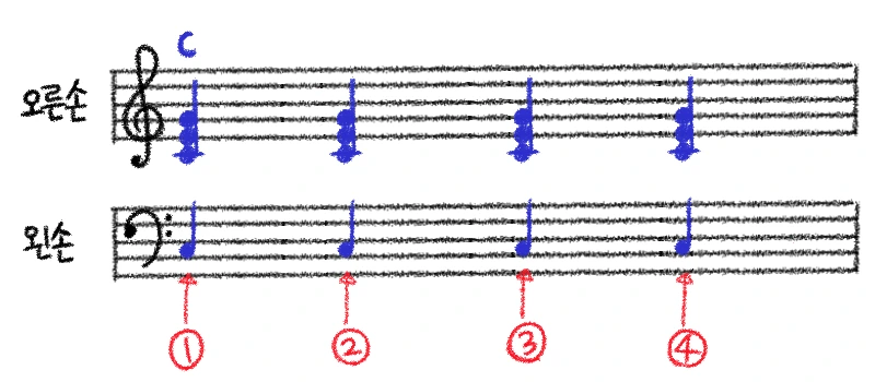 먼저 설명드릴 방법은 제일 직관적인 방법이자, 제가 그나마 자연스러운 척(?) 연주할 수 있는 방법으로 왼손으로 근음 하나만 치는 방법입니다. 4박자의 정박으로 오른손도 왼손과 동일하게 한 박에 한 번씩 치는 방법입니다. 위의 그림을 참조해주세요.