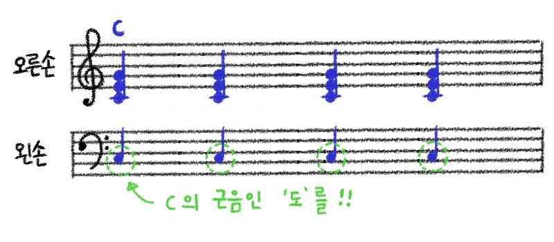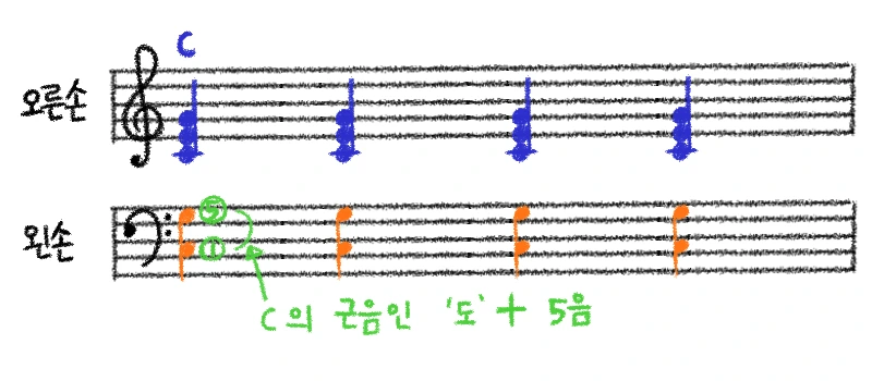 여기서 조금 더 발전하면 왼손으로 근음을 옥타브로 친다거나(ex. C 코드를 친다면 낮은 도와 높은 도를 눌러주면 됩니다.), 위의 그림처럼 코드의 근음과 5음을 같이 치는 방법으로 나아갈 수 있습니다. 여기서 왜 근음과 3음을 치면 안 되는 걸까요? 하는 질문을 던지실 수도 있으실 텐데요. (제가 했다는 건 아닙니다........) 왼손은 오른손보다 아무래도 건반의 아래쪽에서 연주하게 되는데 아래음을 눌러주면 진동이 발생하면서 다른 음의 소리도 섞이는 현상이 나는데 근음과 3음을 쳐주면 그 현상이 더 심해져 다른 음이 섞여 들리는 경우가 생기기 때문에 근음과 5음으로 눌러주는 게 더 자연스러운 소리를 나는데 도움이 된다고 합니다.