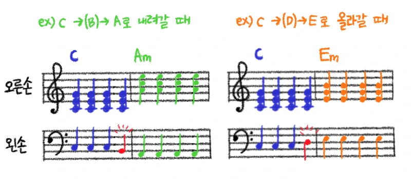 여기서 더 발전해보면 코드와 코드의 사이음으로 연결해주면서 코드를 넘어가는 방법도 있답니다! 이 방법을 좀 더 자세히 설명드리면 예를 들어서 C 코드에서 E 코드로 간다고 하면 사이에 D음이 있죠? 이럴 때는 D음을 코드를 옮기기 전 마지막 박자에 넣어주면서 다음 코드로 넘어갈 수도 있습니다. 아래의 그림으로 예를 보여드릴게요.