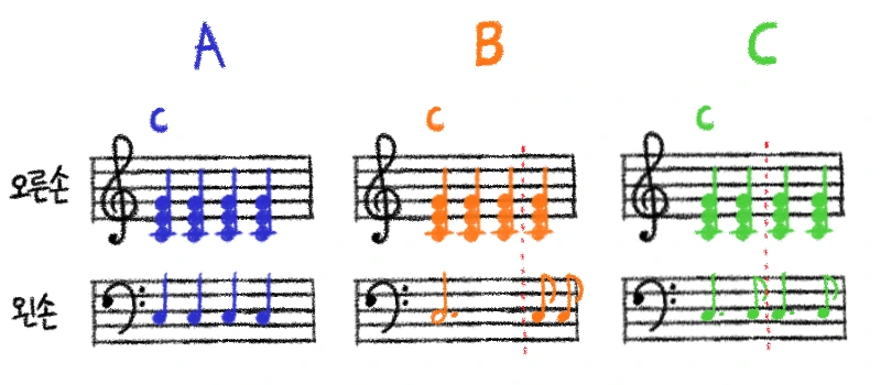 어떤 연주 법인가에 대해 빠르게 결론부터 말씀드리면 4분의 4박자 곡에서 박자 1번당 코드를 1번 누르는 연주법이라고 할 수 있습니다. 4분 음표 한 번당 오른손은 코드를, 왼손을 코드의 근음을 ‘땅! 땅! 땅! 땅!’ 하고 4번 연주해주면 되는 연주법입니다. 어렵지 않죠?