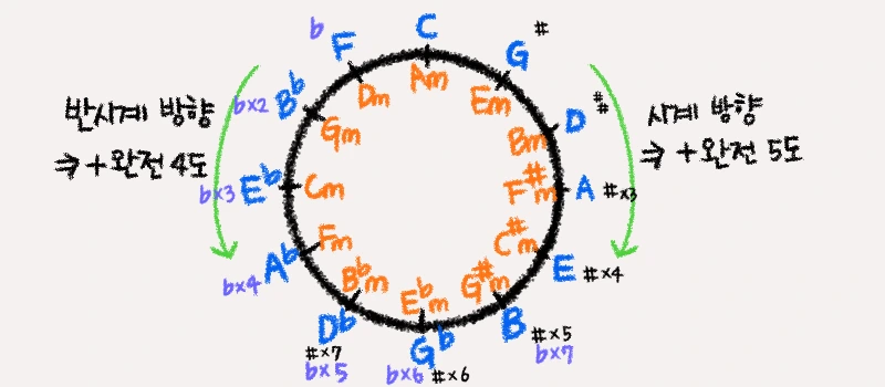 간단히 왜 배우는지에 대해 알아봤으니 이번에는 실제로 4도권(5도권)은 무엇인지에 대해 알아보려고 합니다. 4도권은 C에서 출발해 반시계 방향으로 완전 4도씩 진행해서 다시 C로 돌아오는 사이클을 말합니다. 5도권은 반대로 완전 5도로 음을 진행시키면서 시계방향으로 출발해서 돌아오는 사이클을 뜻합니다.