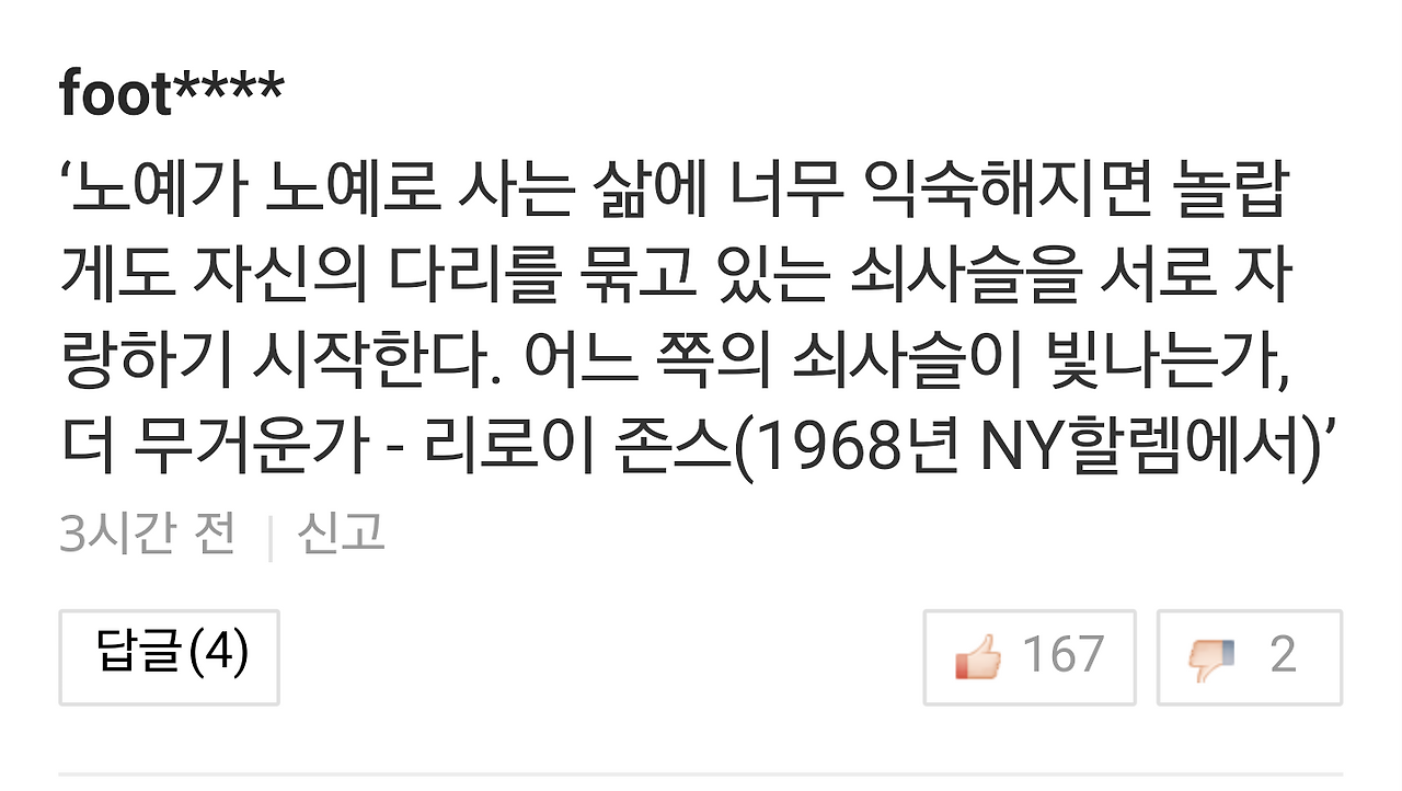 몇 주 전, 나 같이 고민이 많은 사람들에 대한 기사에 있던 댓글이 너무 마음에 와 닿아 캡처해두었다. 나는 이 노예 같은 삶에 익숙해지고 싶지 않다. 점점 적응되는 나 자신이 싫고, 더 나은 미래를 가지기 위해 끊임없이 발버둥 칠 것이다.