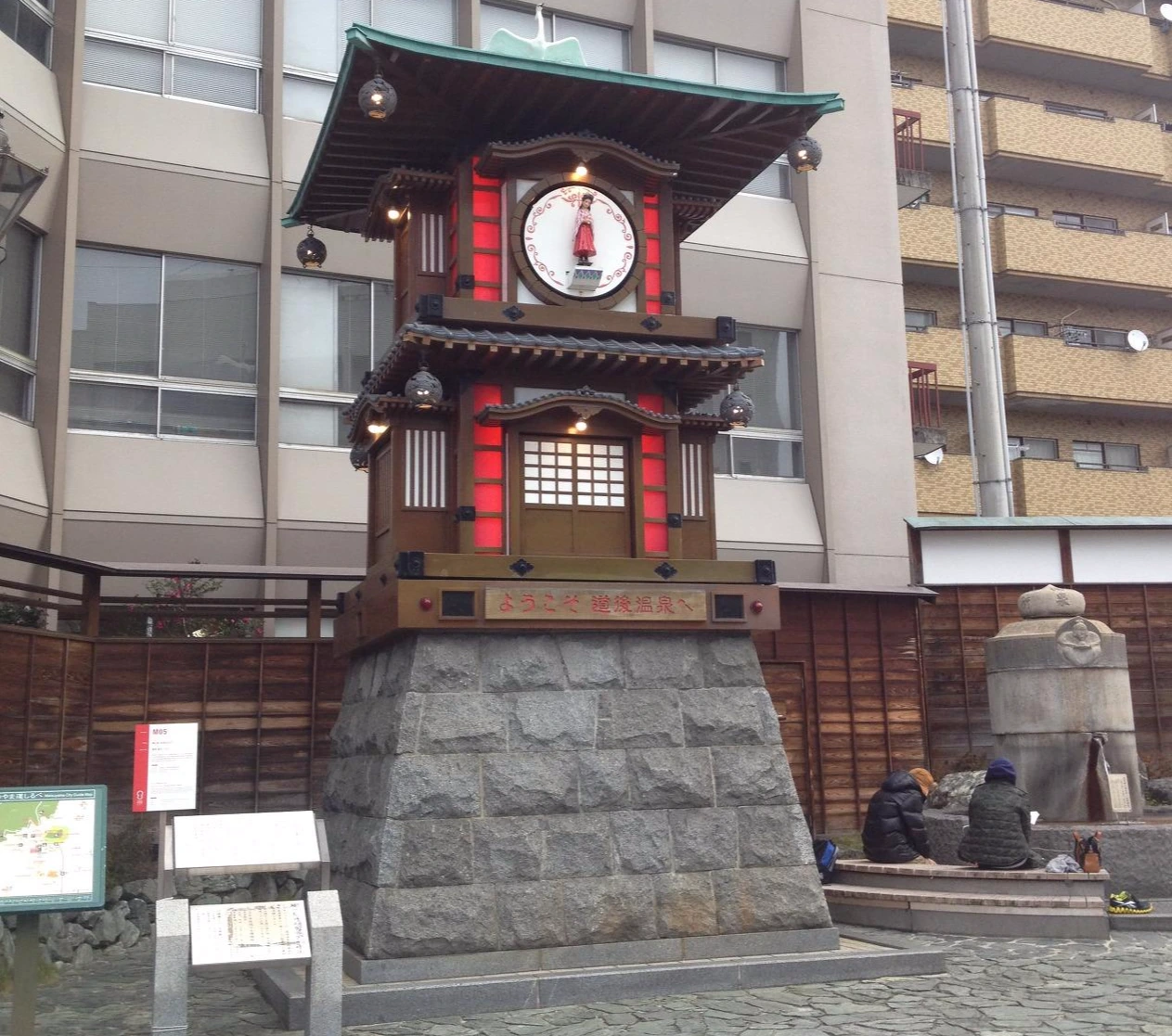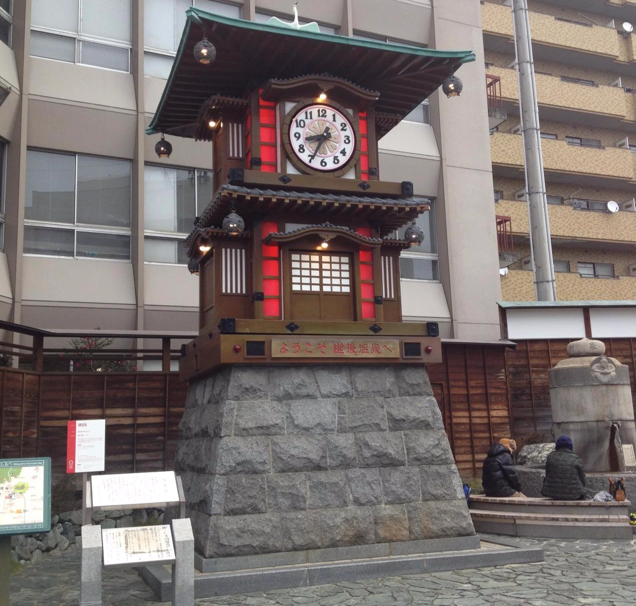 작은 기차를 타고 마츠야마시 도고온천 역에 내리면 일본 소설 '도련님(일본어로 봇짱)'의 주인공들이 매시 정각 시계탑에서 나타난다. 정각이 아닌 경우에는 정상적인 시계 바늘이, 정각에는 소설 속 등장 인물들이 나온다. 이것이 봇짱 자동인형(가라쿠리) 시계! 시계 바로 옆에 있는 것이 족탕(호조엔)인데, 온천물에 피로한 발을 담고 족욕을 할 수있는 공중 족욕탕(무료)이다.