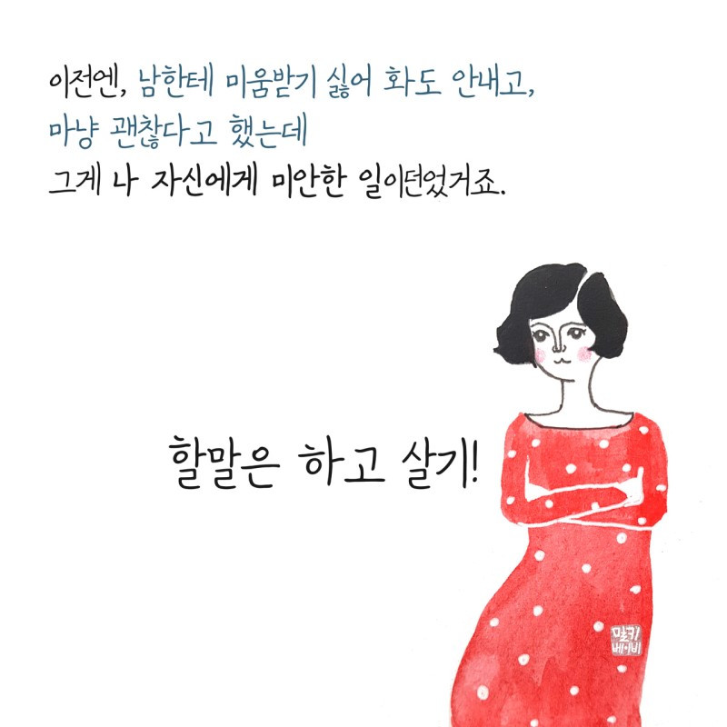모난 돌이 되지 않기 위해, 무던하게 보이기 위해 우리는 너무 애를 쓰고 있는지도 모릅니다. 그렇지만 내 마음 내가 돌보지 않으면...아무도 안돌봐줍니다. 그런 사실을 엄마가 되고 나서야, 뼈져리게 느꼈어요. 남의 시선이 아닌 내 마음에 솔직하게 살아요 .