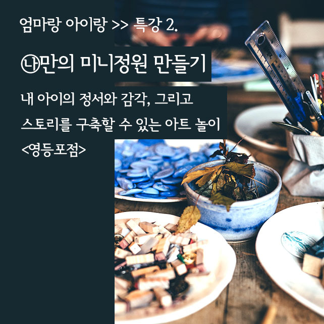 2)'나만의 미니 정원 만들기' 는 아이들이 앞으로 어떤 지적/예술 활동을 하든, 그 바탕이 되는 취향과 정서를 키워주는 놀이에요. 자신만의 이야기 정원을 만들고, 예쁘게 포장해서 돌아갈 수 있는 프로그램. (신세계 영등포점 only)