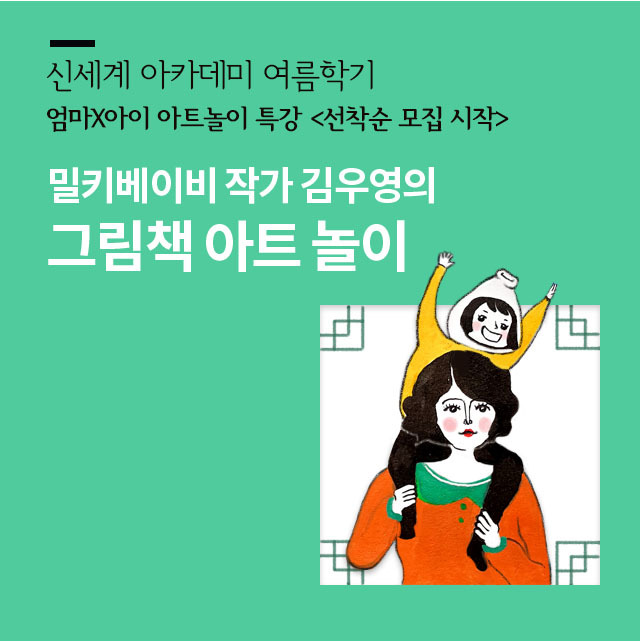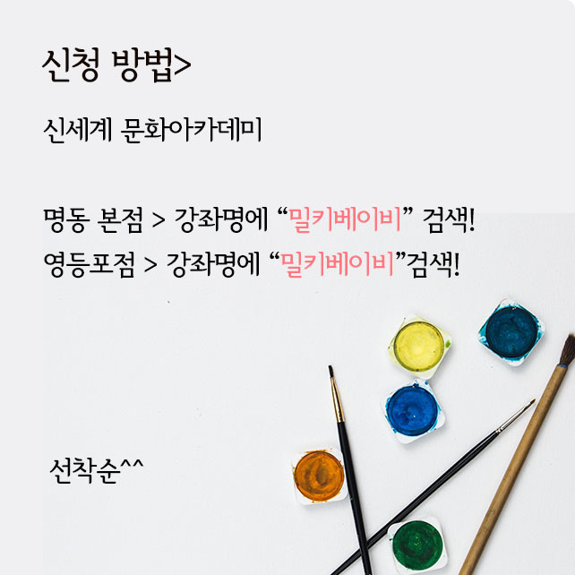 아이와 엄마(혹은 아빠)가 같이 아트놀이를 할 수 있는 클래스를 열려고 해요. 7월 매주 토요일, 여름방학에 신세계 명동 본점/ 영등포점에서 함께 밀키베이비 아트놀이를 하실 가족분들을, 선착순으로 모집 중^^