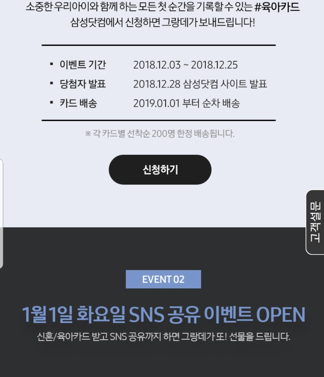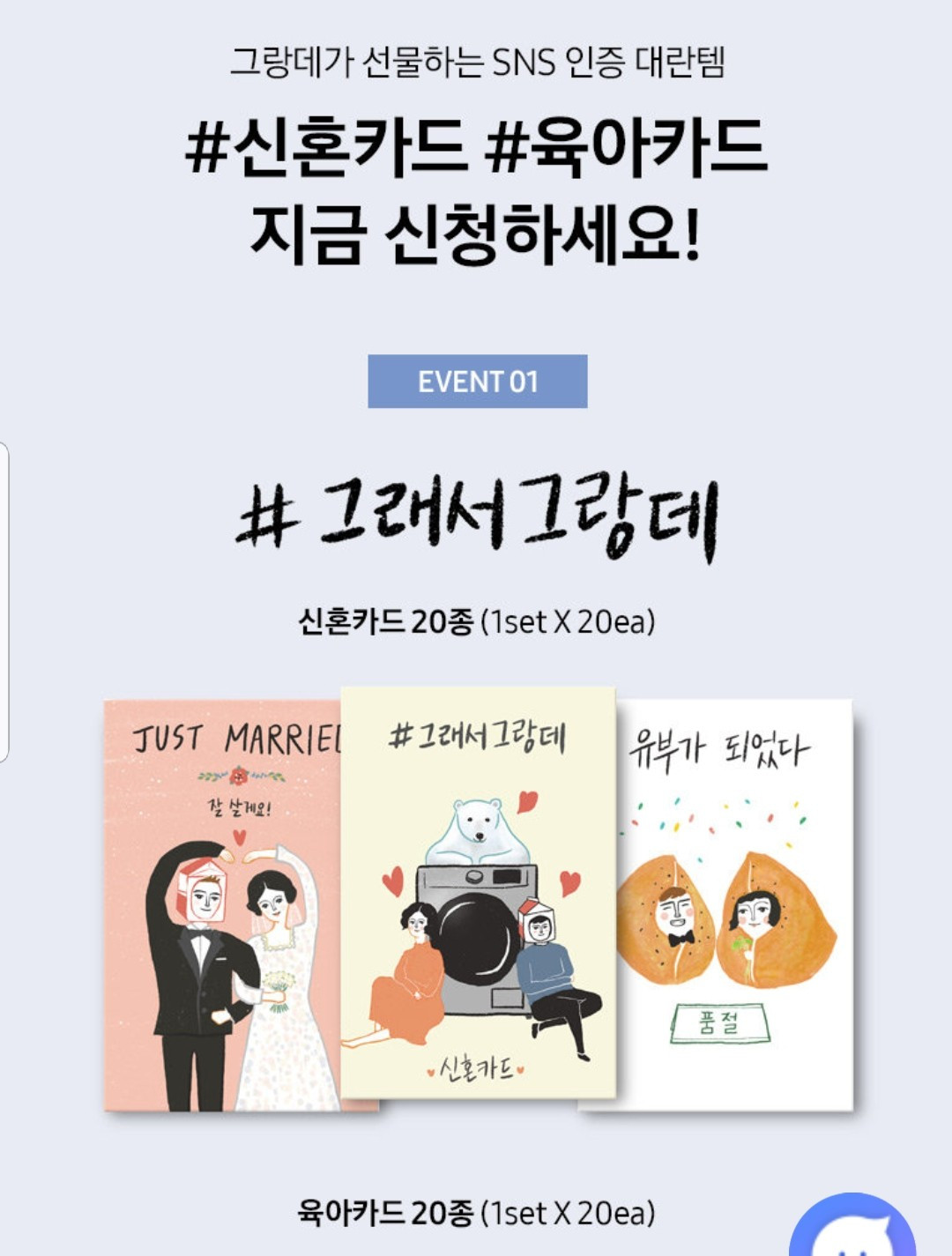 지금 삼성 닷컴에서는 신혼카드, 육아카드 각 200개씩 무료로 드리는 이벤트를 하고 있어요. 풀 컬러 20장의 예쁜 일러스트 카드를 득템하실 수 있는 기회^^ 참여 고고고