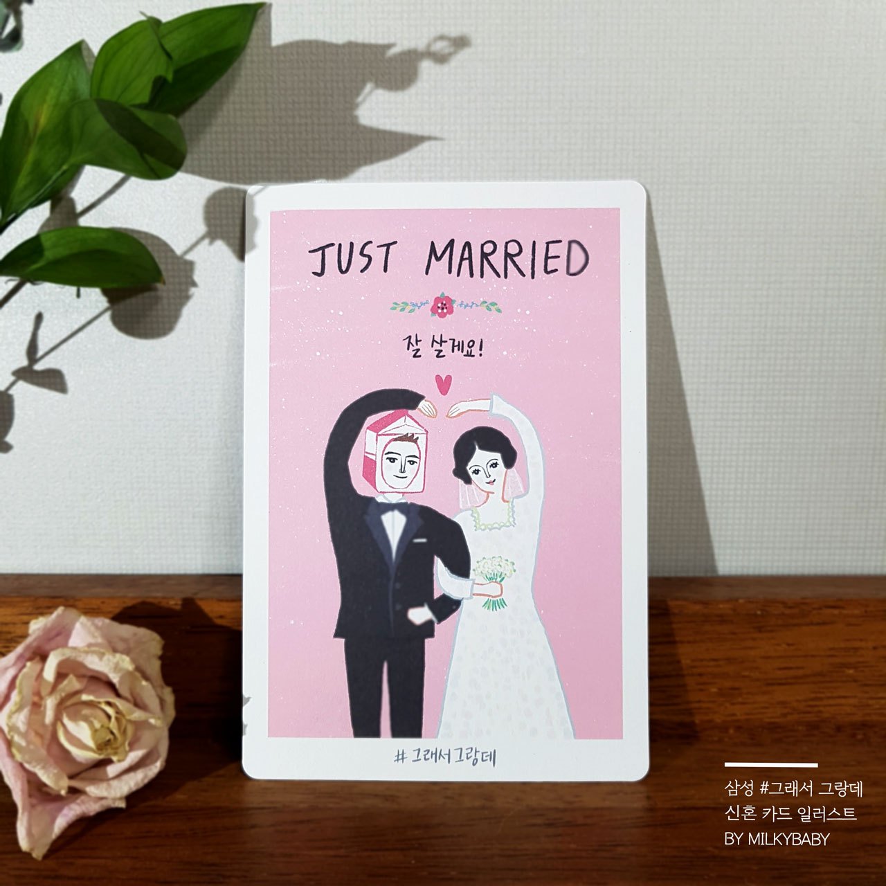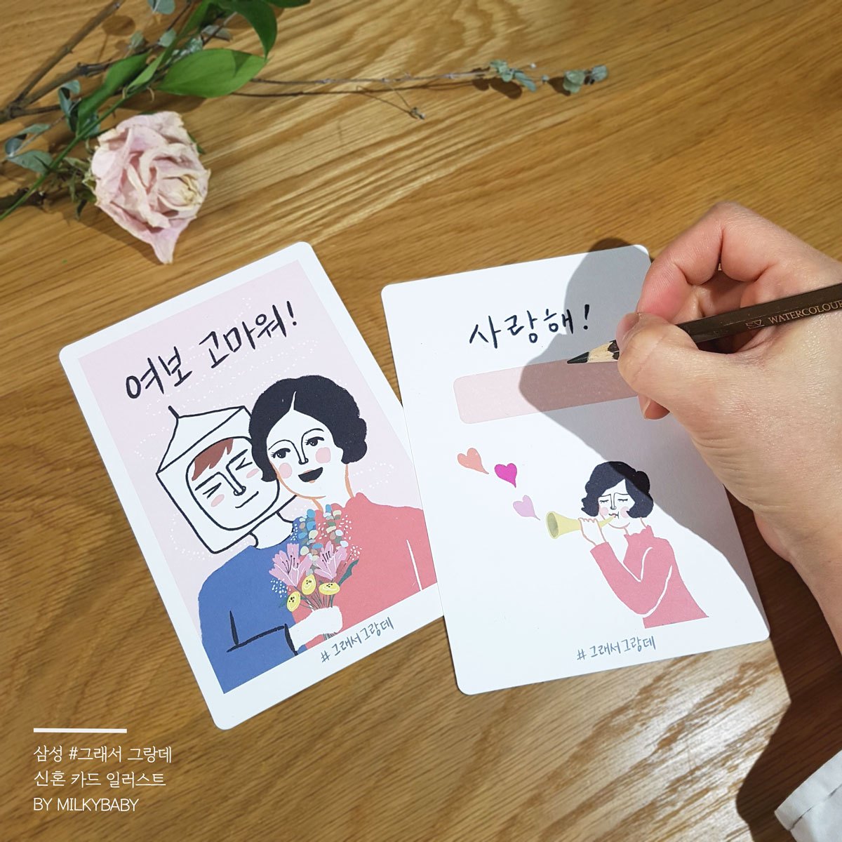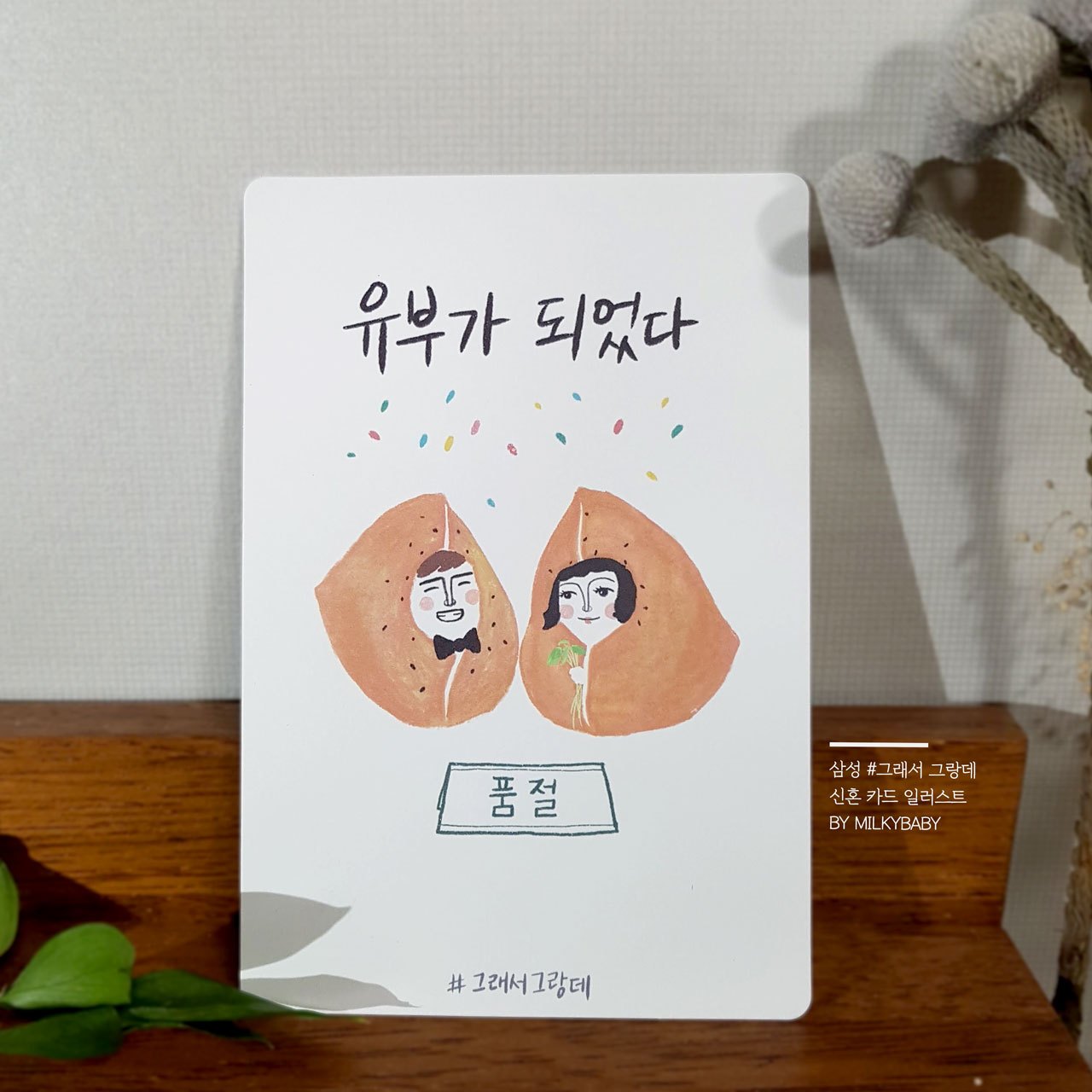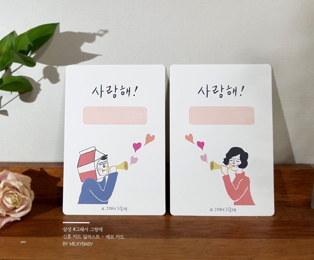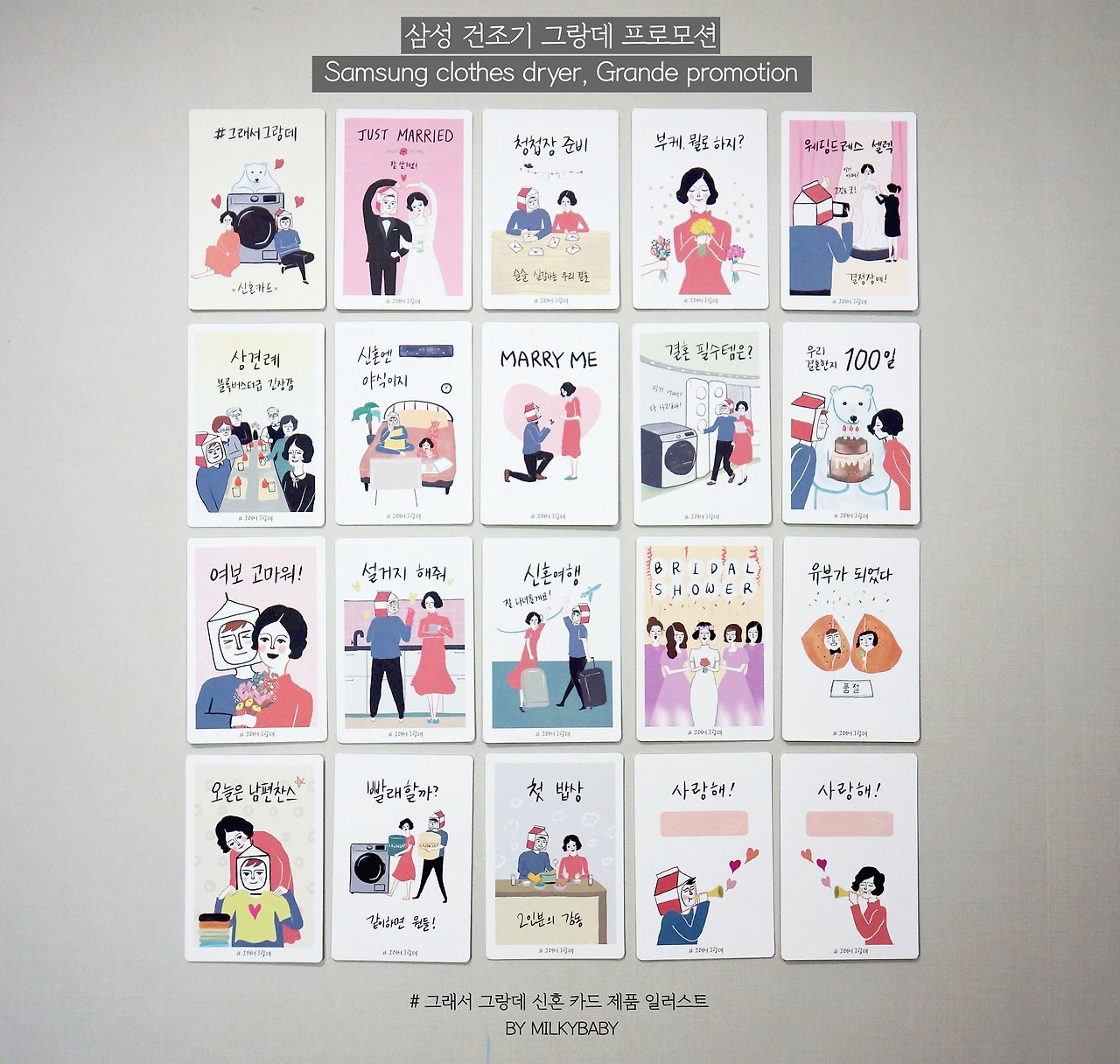 저의 신혼 시절, 그리고 주변에 신혼을 즐기고 있는 지인들을 떠올리며 즐겁게 작업했어요. 청첩장을 하나하나 봉투에 넣던 기억, 남편과 같이 야식도 먹고 늦게까지 영화도 보다 잠들어도 괜찮았던 그 시절 말이죠! 이 신혼 카드도 역시 20종으로, 전체적으로 파스텔 톤의 따뜻한 느낌입니다. 밀키베이비 특유의(?) 유머도 들어있으니 잘 살펴봐 주세요♡