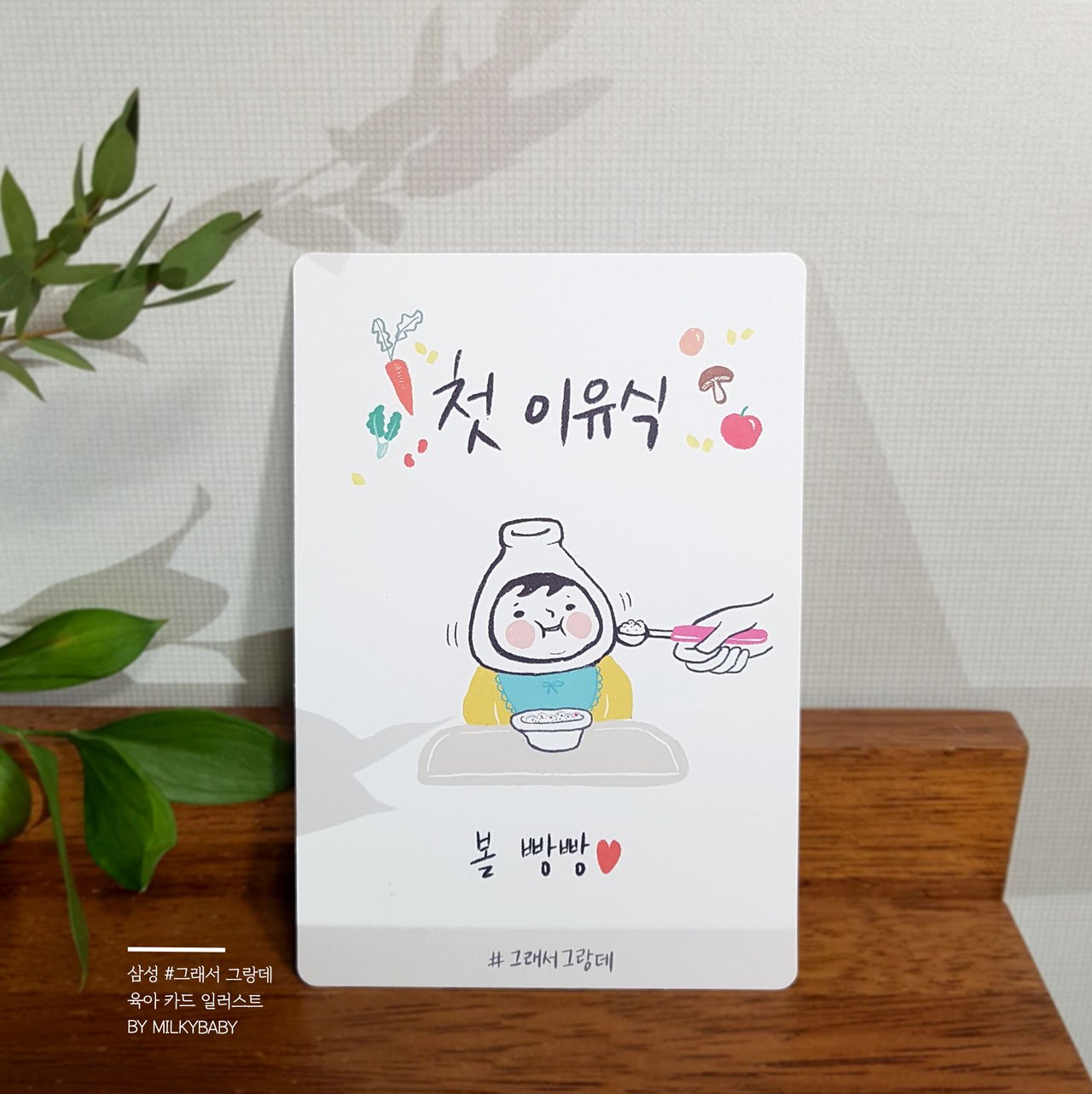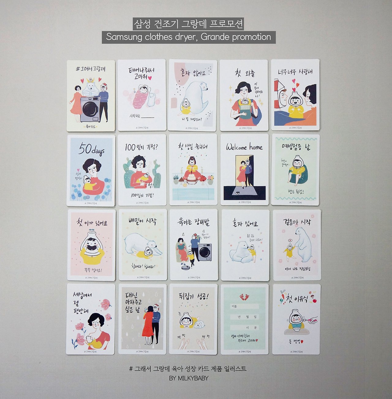 태어난 아이와 집에 처음으로 들어온 순간부터 백일과 돌, 처음 이유식을 먹은 날 등등을 기념할 수 있게 만들었어요. 그림을 그리는 것 보다 카드 주제를 20가지로 추리는 일이 어려웠죠^^