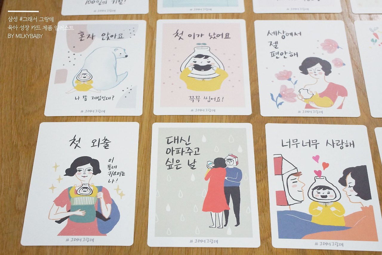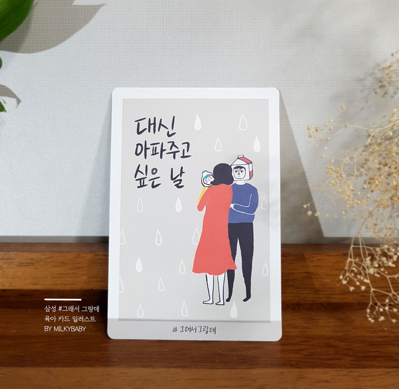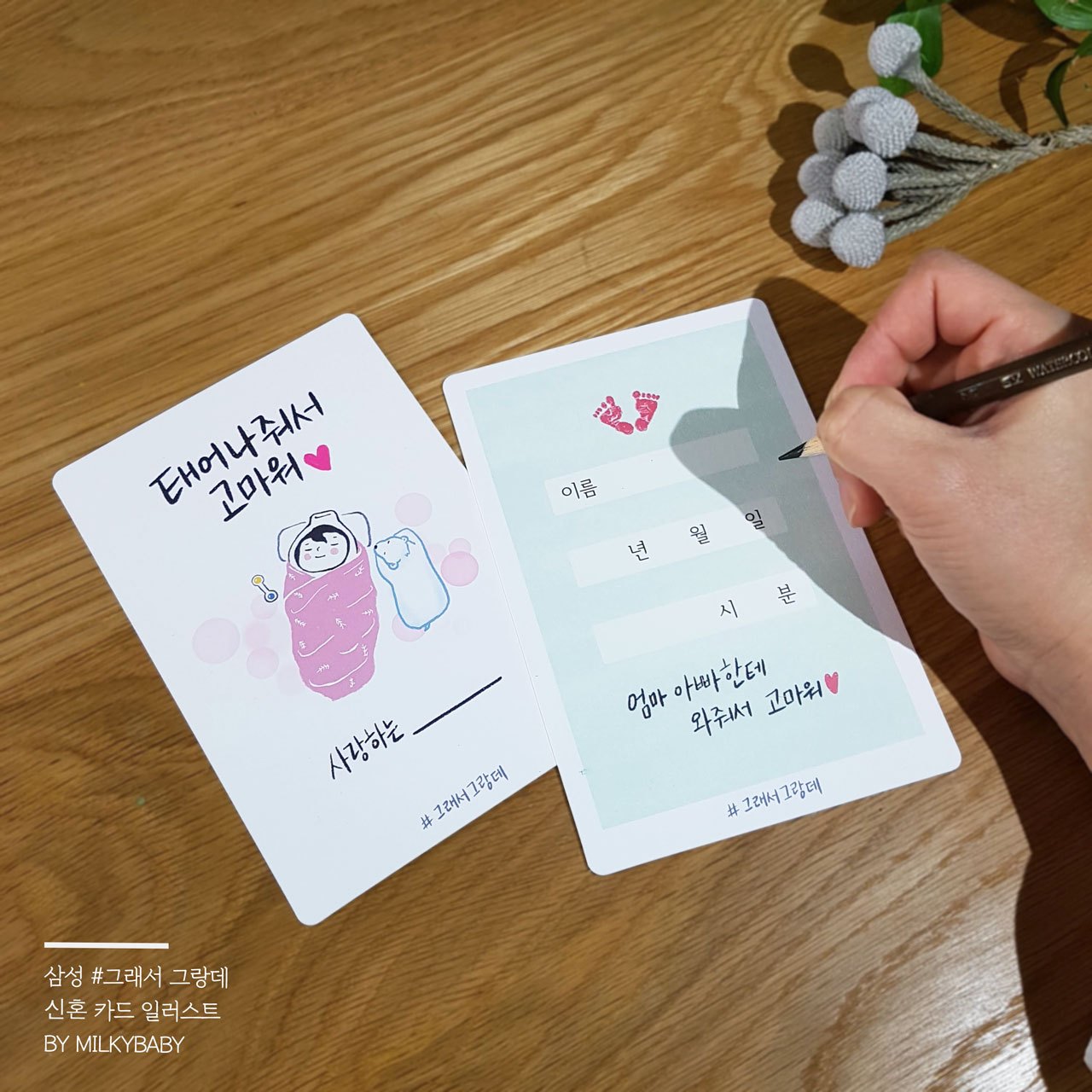 육아 초반에 부모와 아이가 겪는 순간들을 20가지로 그려 담았어요. 밀키베이비 육아그림 에세이를 구독하고 계시는 분들은 익숙하시죠?ㅎㅎ 제 스타일과 손글씨를 온전히 담은 일러스트 카드에요.