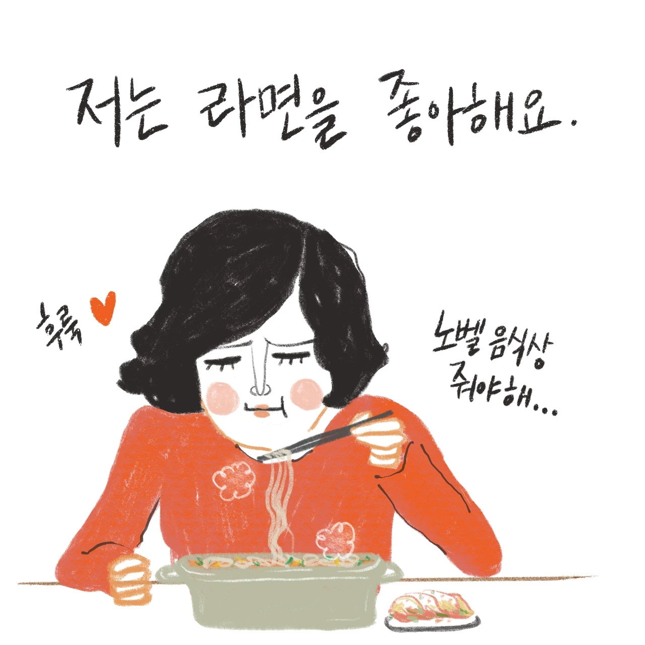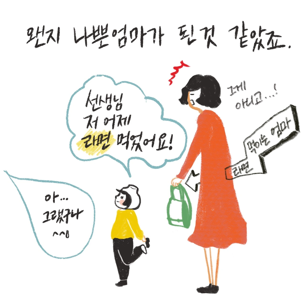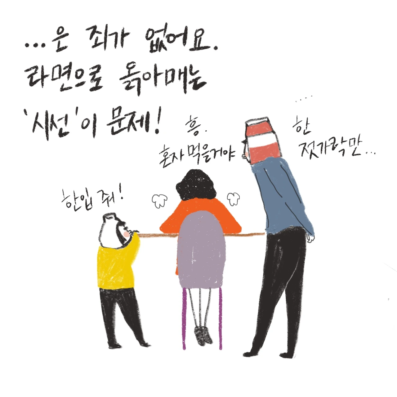 밀키가 제 라면을 뺏어먹을 때마다, 남편이 라면을 끓여먹었다는 사실을 누군가에게 말할 때마다 ‘마음속 깊이 콕콕 캥기는 요 느낌 뭐지?’ 싶었어요. ‘가족들의 영양을 챙기지 않는 죄인'이 되는 기분이었죠.