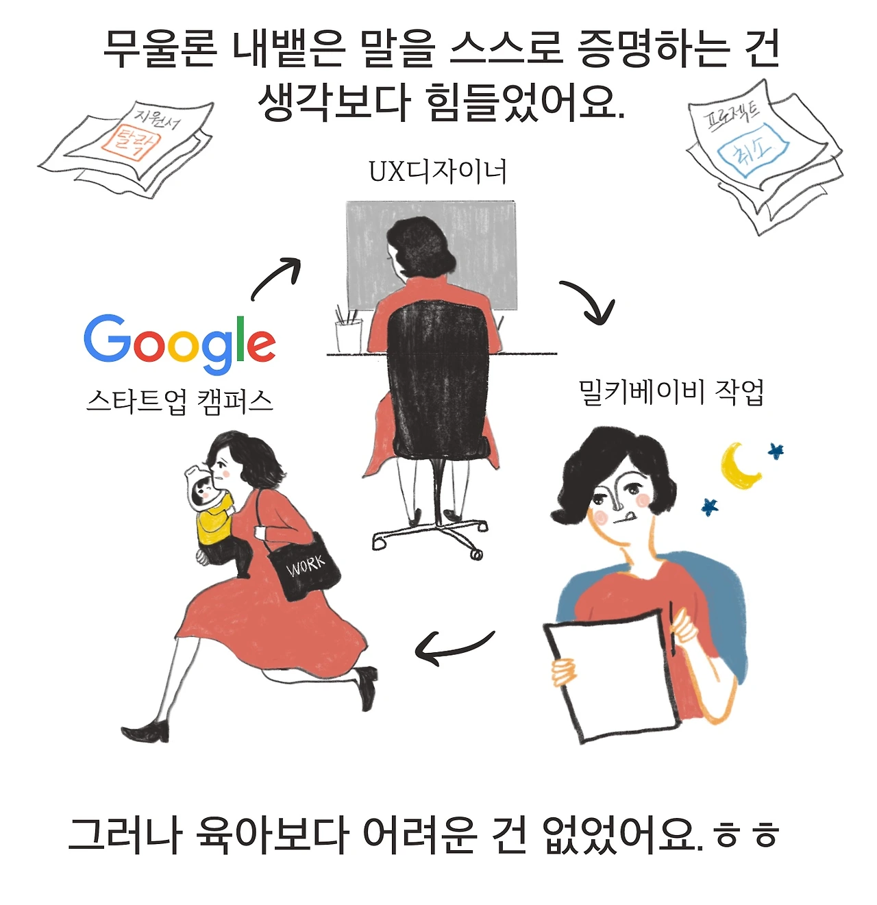 이후 저는 커리어의 의미를 내가 즐기면서 잘할 수 있는 일로, 자기 발전을 이루는 것으로로 정했어요. 사회로부터 소외된(?) 기간 동안 내가 좋아하는 것을 업으로 삼기 위해 필요한 일들을 실행에 옮겼지요. 구글에서 창업 교육을 받으며 마케팅과 브랜딩에 대한 지식을 쌓고, 프리랜서로서 UX 디자인 활동을 이어갔어요. 동시에 밀키베이비 연재를 시작하고, 이어 책을 출간하고 활동 영역을 넓히며 스스로 살아남는 방법을 배웠어요. 이후 다시 한 기업의 UX 디자이너로 일하고 있지만 직장과 직함에 의존했던 이전의 나와 많은 부분 달라져 있었어요.