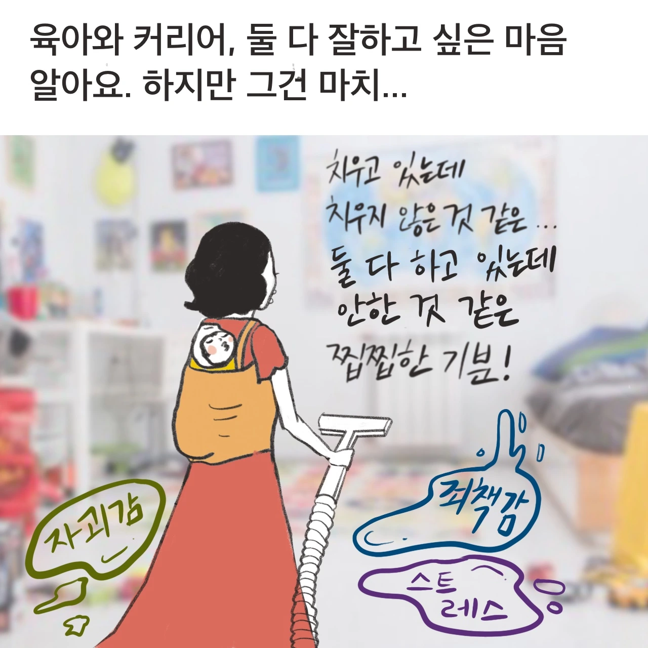 결론부터 말하자면 커리어와 육아의 완벽한 균형을 찾고자 하면 엄마가 스트레스에 질식할 수 있다는 점이에요. 현실은 특정 시기에는 육아에 집중할 수 밖에 없고, 어떨 땐 커리어에 집중해야 하는 시소게임의 반복이죠. 전 세계의 많은 여성들이 똑같이 힘들어하는 고민이자, 어떤 국가의 정책이나 기업의 복지도 완벽히 해결하지 못한 문제랍니다. 육아나 일, 둘 다 잘하지 못할 것 같다는 불안, 둘 다 잘하지 못하고 있다는 죄책감은 이제 그만 내려놓아도 괜찮아요.