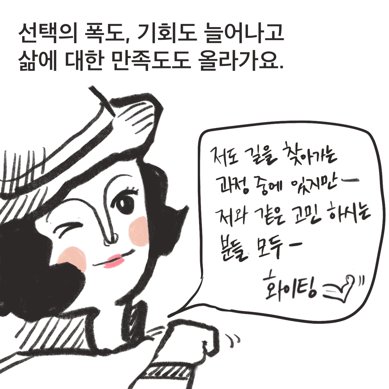 2017년 딜로이트의 연구에 따르면, 지금 하고 있는 일을 좋아하지 않는 사람들이 87% 나 된다고 해요. 육아도 벅찬데, 하고 싶지 않은 일을 해야 하는 상황은 이중 부담이죠. 때문에 내가 좋아하는 일을 찾고, 해나가는 것은 너무 중요해요. 남에게 끌려가는 삶이 아닌, 나를 위해 살 수 있는 기회이기도 해요. 이 일에 앞서 커리어에 대한 자기만의 정의가 중요하답니다. 육아와 병행해서 하는 만큼, 나에게 많은 의미가 있고, 즐길 수 있는 일을 찾아 나가시길 바라며!