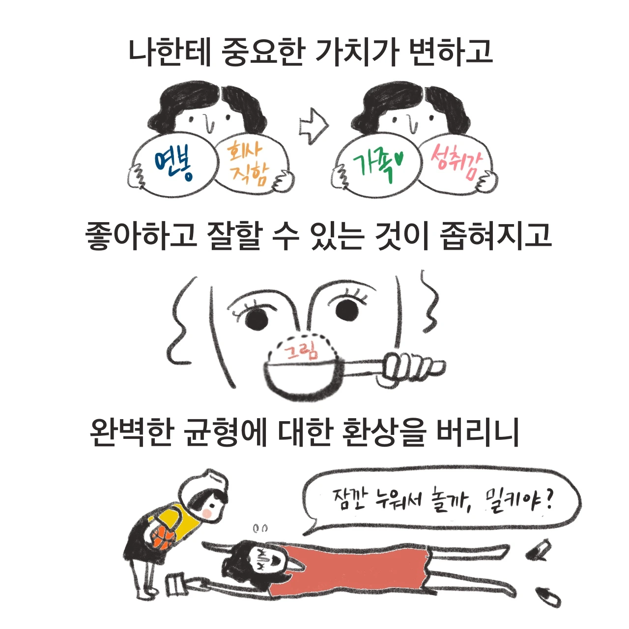 출산을 기점으로 커리어를 자진 포기한 분들 중 상당수는, 기존의 일과 육아 사이에 끊임없이 저울질을 하다 힘든 결정을 내린 걸 거예요. 저도 이 시기에 휴직과 퇴사를 겪으면서 내 삶에서 커리어가 주는 가치뿐 아니라 커리어의 정의 자체도 다시 생각하게 되었어요. 사회에서 정의하는, 수직적인 성장을 의미하는 커리어를 추구하자니 육아를 비롯 많은 것을 포기해야 할 것 같았죠. 내게 성취감을 주는 일로서 커리어를 쌓자는 생각이 강해졌고, 가족과의 시간이라는 가치를 우선순위로 두자 삶의 방향이 달라졌어요.