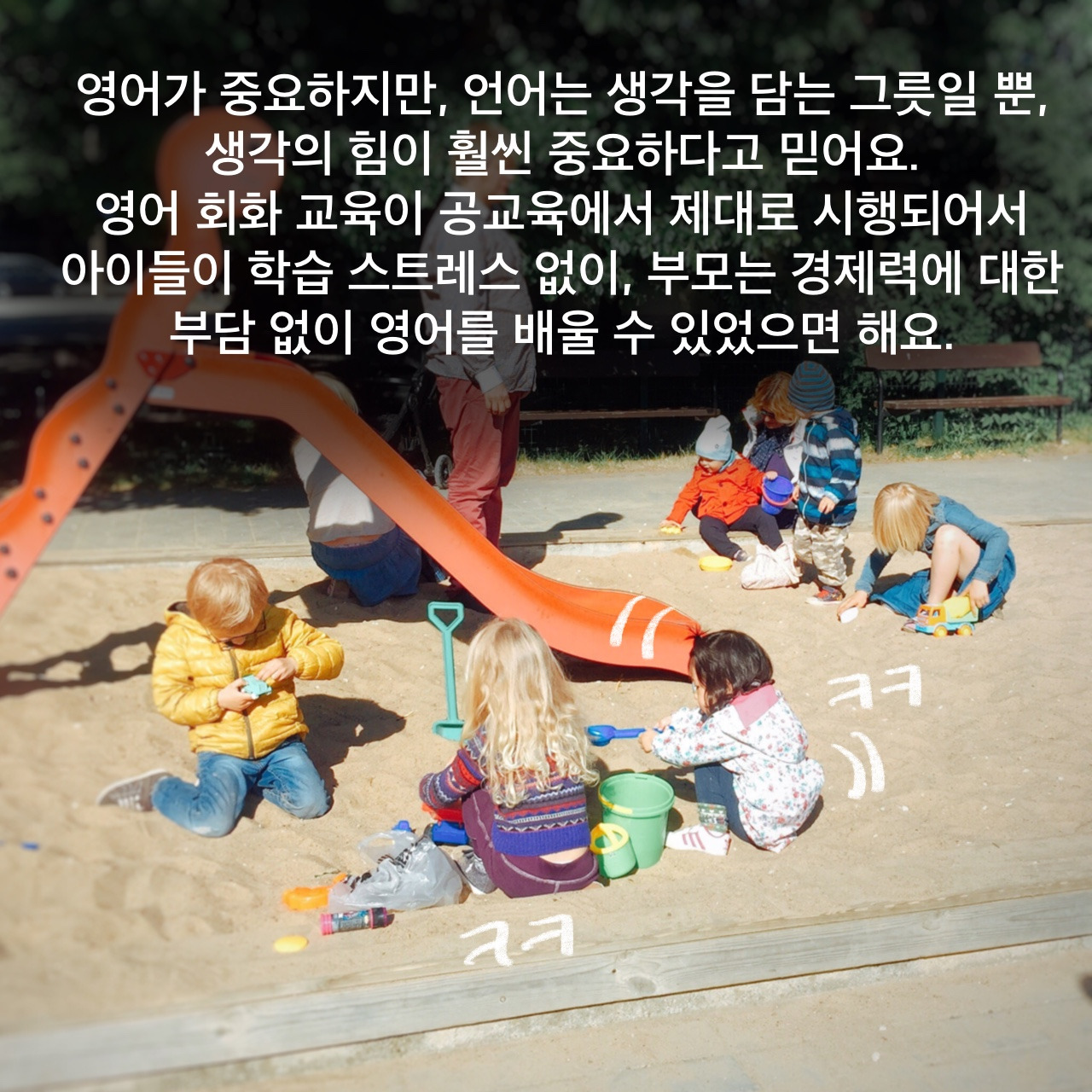 일반 유치원은 국가보조금에 조금 보태면 다닐 수 있고 영어유치원은 월 100만 원 정도 더 내야 하는데 솔직히 금전적 부담이 되면서도 과연 가성비나 효과가 있을지...