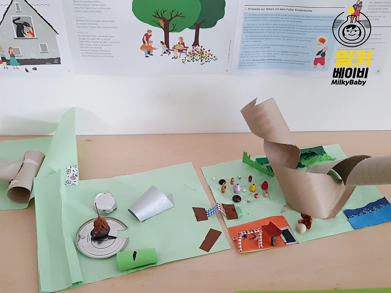독일에서 두번째로 오래된 유치원에서, 마침 연령 통합 수업을 하고 있었어요. 원장님께 이런 수업의 장단점을 물어보았어요. 원장님은 큰 언니들이 작은 아이를 도와 놀이를 하는 모습을 가리키며 동생들이 언니오빠에게서 많이 배우기도 하지만 큰 연령대도 배울점이 많다고 대답해 주셨죠. 밀키처럼 '외동'이 많아지는 요즘, 다른 연령의 아이들과 함께 지내보는 경험이 필요한 것 같아요. 실제로 밀키는 1년간 연령 통합 교육을 받았는데, 윗 연령대들에게서는 조금 빠른 발달과정을 미리 접하고 ('...나보다 잘하는 사람이 많다니!(충격)' 등등) , 아래 연령대들과 지낼 때는 인내심과 자제력 ('동생이니 참아야지 부들부들..'등등)을 배우는 것 같았답니다.