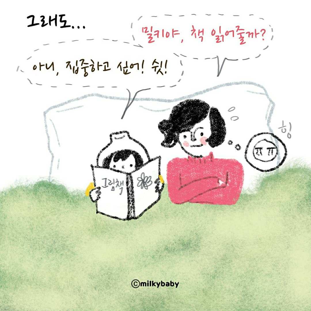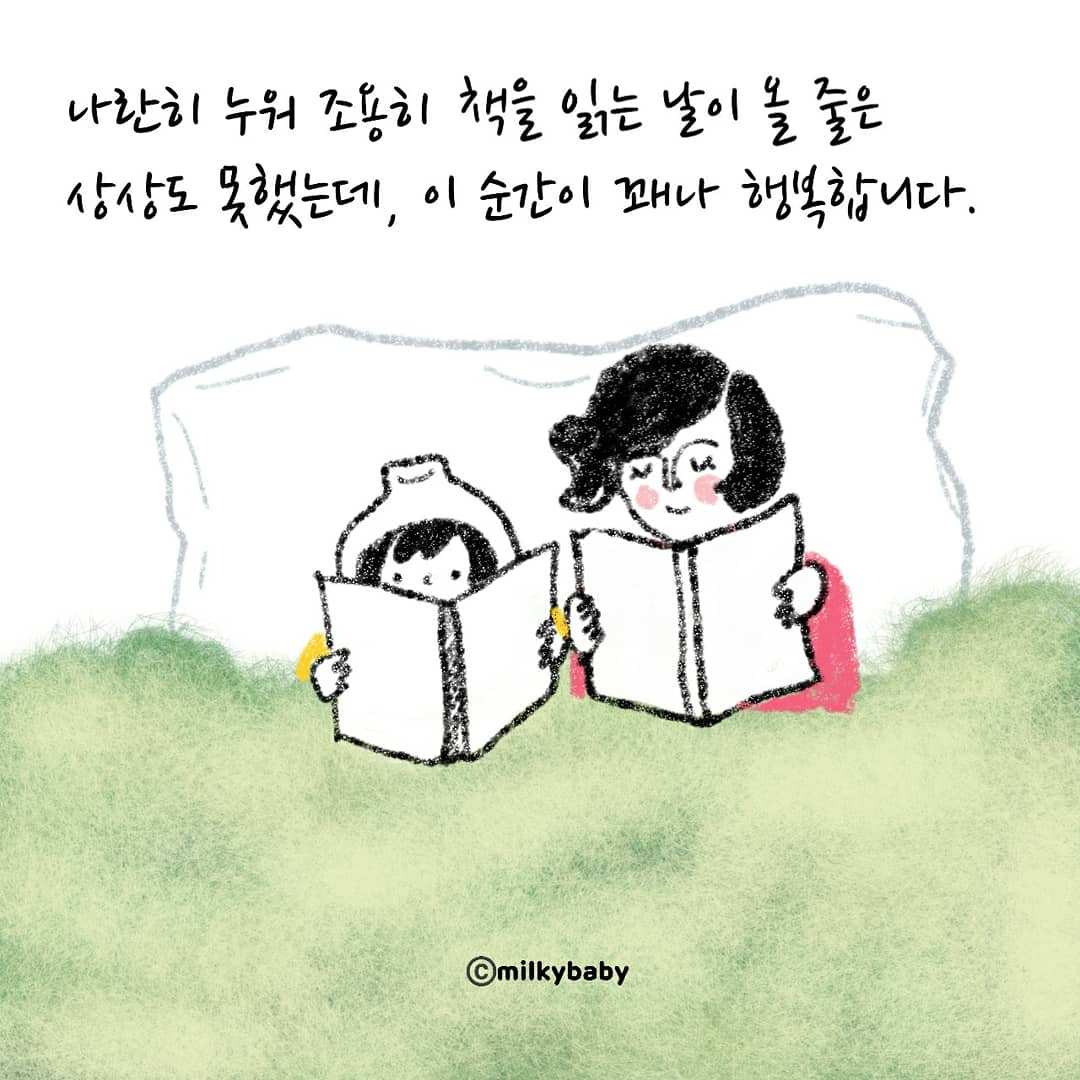 요즘은 제가 소파에 앉아 책을 읽기 시작하면 밀키도 책을 골라와서 제 옆에 자리를 잡아요. 나란히 소파에 앉아 조용히 둘이 책을 읽죠. 이런 날이 올 줄은 상상도 못 했는데, 이 순간이 꽤나 행복합니다.