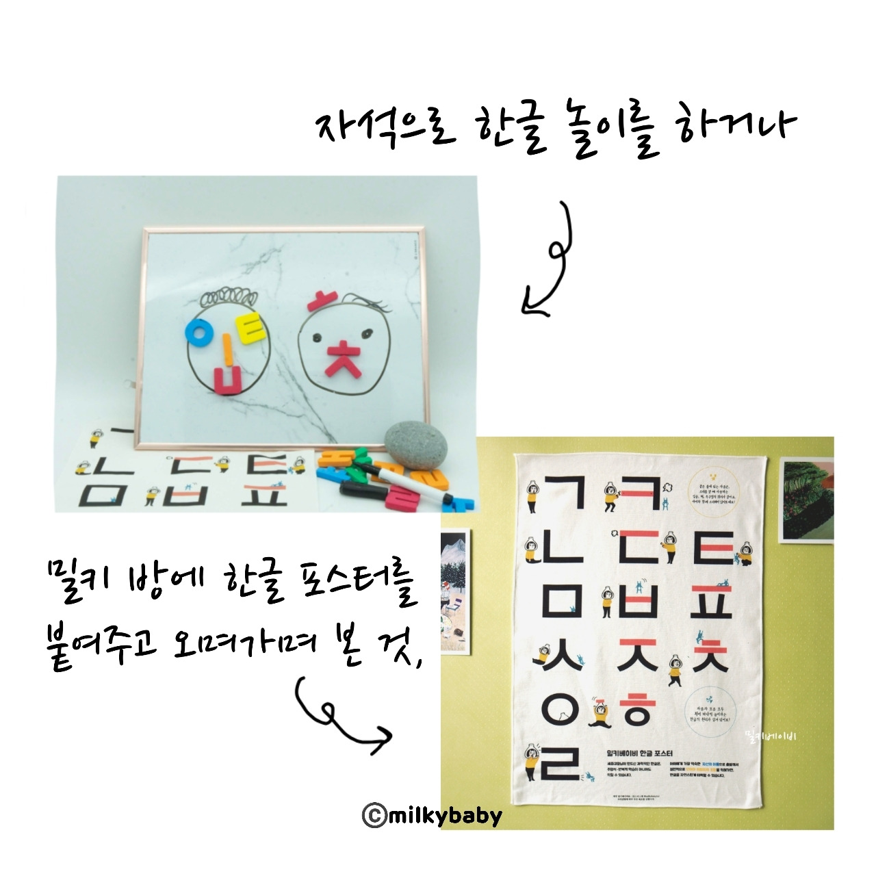 밀키가 단어를 물어볼 때마다 한 번씩 써주거나, 제가 만든 한글 포스터를 가리키며 이게 'ㅎ'이라는 거야~ 한번 말해주고 끝. 다만 똑같은 것을 반복해서 물어봐도 차근히 알려줬어요. 아이에겐 굉장히 어려울 테니까요. 그렇게 눈으로 입으로 반복해서 익히면서 낯익은 단어들이 늘어났어요. 지나가는 간판도 읽고, 표지판도 읽고, 과자 봉지도 읽어보고, 그렇게 생활 속에서 익히게 되었어요.
