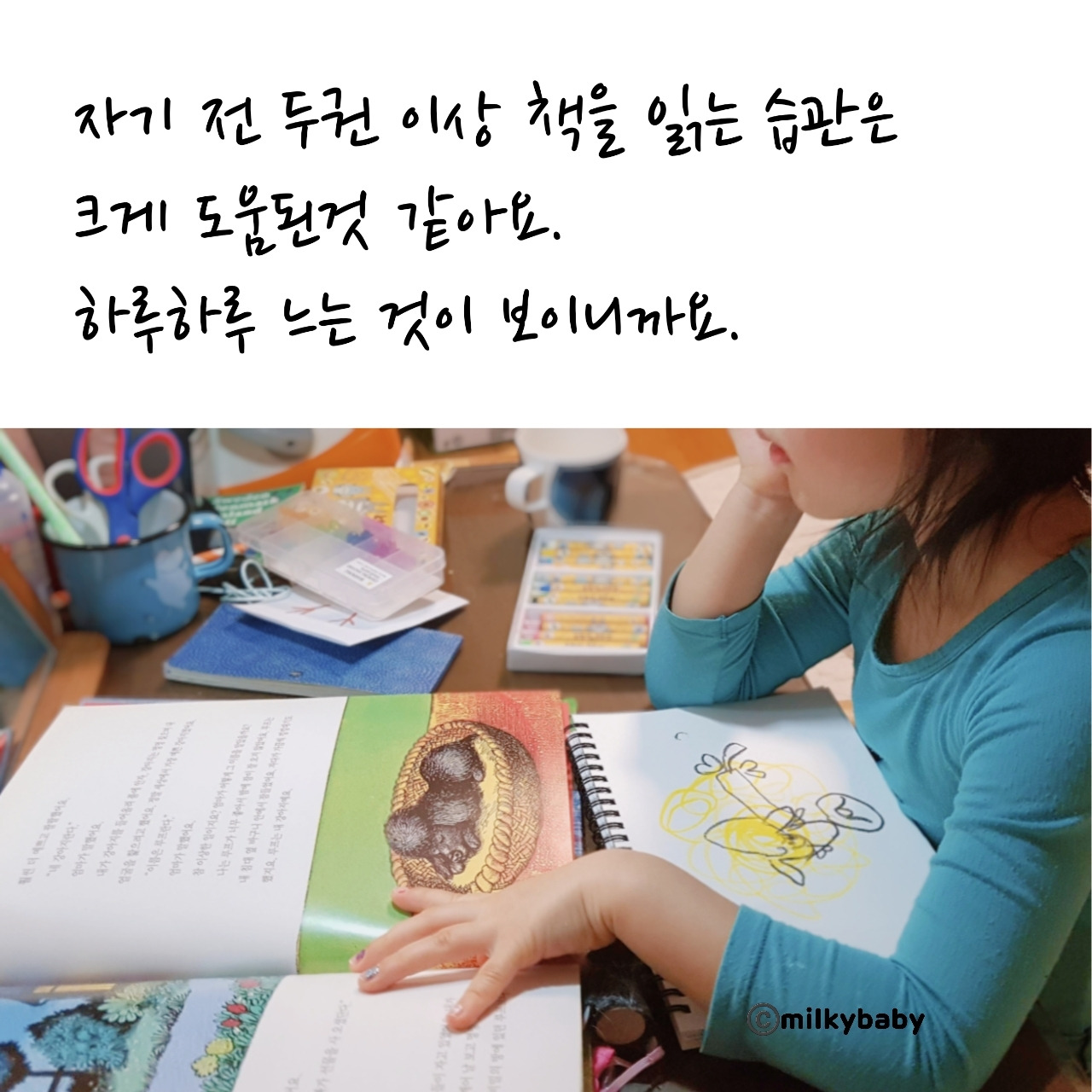 모든 것의 원동력은, 아이가 흥미로워하는 '이야기' 였어요. 5살 때부터 밀키는 애정 하는 그림책을 잘 때도 보고, 밥 먹을 때도 보고, 아침에 일어나자마자 보고. 그림만 보다가 조금씩 제목 속 단어를 읽더군요. 그렇게 얇은 책을 혼자 읽기까지 얼마 걸리지 않았고요.