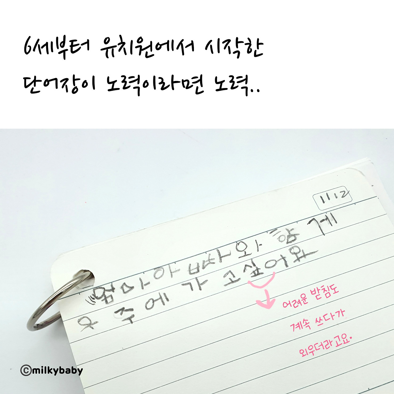 그러나 이론이 아닌 경험에서 얻은 '한글 쉽게 떼는 법'은 아이가 일상에서 한글에 흥미를 갖게 하는 게 가장 좋은 방법 같아요. 밀키는 체계적으로 자음과 모음부터 배운다기보다, 통 단어로 먼저 눈에 익혔죠.