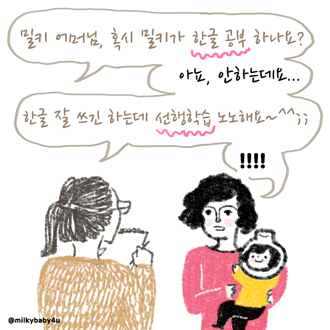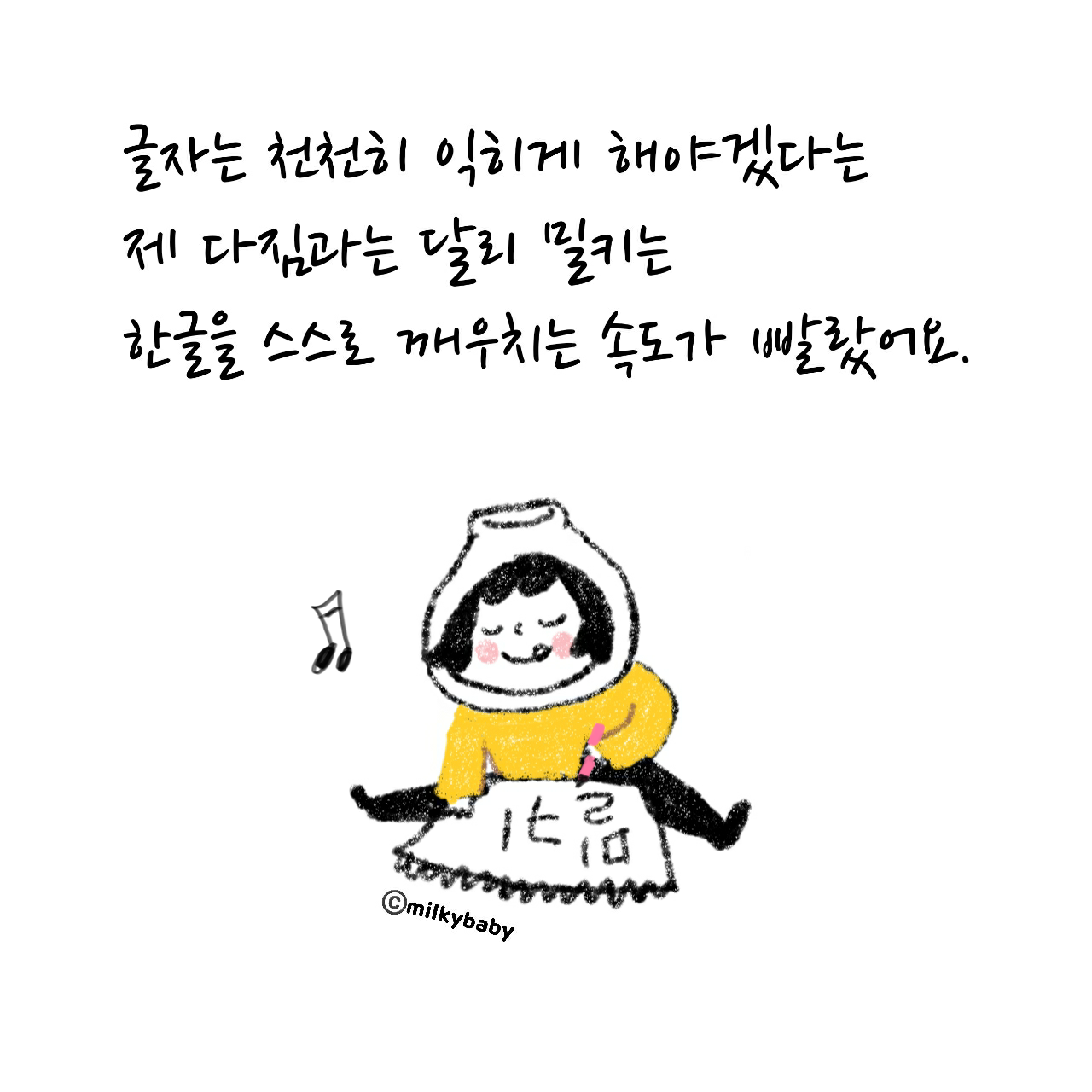 밀키가 곧잘 이름을 쓰자, 한글을 어떻게 가르쳐 줬냐며 선생님들이 도리어 제게 물었어요. 그런데 저는 한글을 열심히 가르쳐 주지 않았어요. 혹시나 해서 반복적으로 자음과 모음을 쓰는 학습지도 사봤지만 아이가 전혀 흥미를 느끼지 못했어요. 어른인 제가 봐도 재미없어 보였 고요.