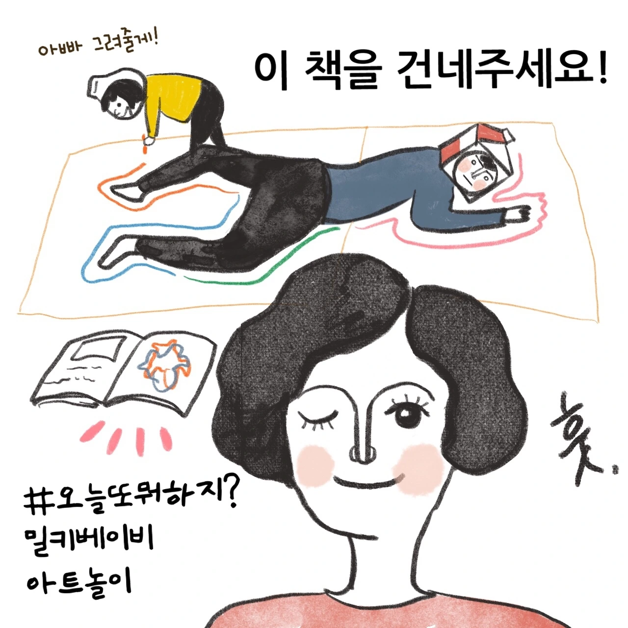 밀키베이비라는 필명으로, 가족의 따뜻함을 그리는 일러스트레이터. UX 디자이너이자 밀키의 엄마. <오늘 또 뭐하지? 밀키베이비 감성 아트놀이>, <우리 엄마 그림이 제일 좋아>, <지금 성장통을 겪고 있는 엄마입니다만> 을 출간하고, 전시와 아트워크숍을 종종 연다. 인스타그램 @milkybaby4u