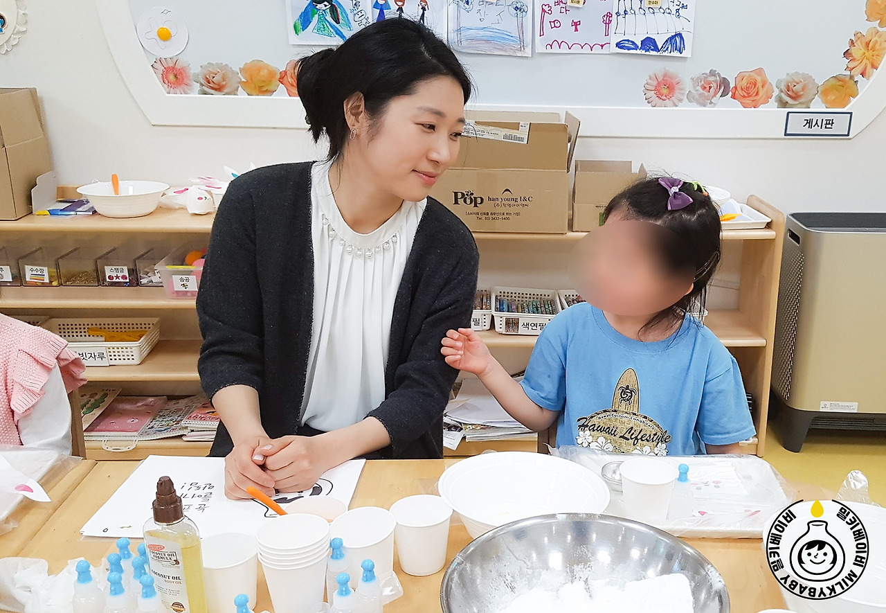 선생님들께서 미리 준비물을 잘 챙겨주셔서 5-6세 어린이 반 친구들과 아트클래스를 수월하게 진행하게 되었습니다. 밀키는 엄마가 '1일 선생님'으로 와서 반가워했고, 아이들은 톡톡 튀는 질문과 함께 놀랄 만큼 집중하는 모습을 보여주었습니다. 완성된 입욕제를 보며 즐거워하는 아이들이 너무 귀여워서 저도 두 시간 내내 힘이 났습니다.
