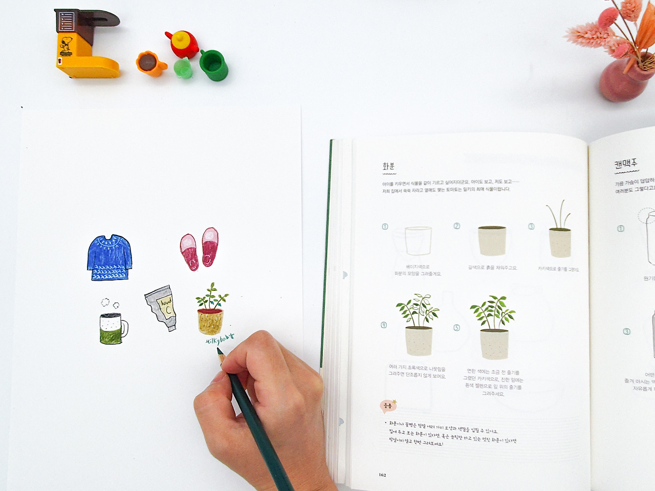 책 속에는 동식물, 사람 그리기, 일상 소품 그리기 등 예제들이 있는데 나의 스타일을 만들어갈 수 있게끔 체계적으로 안내해 주고 있습니다.