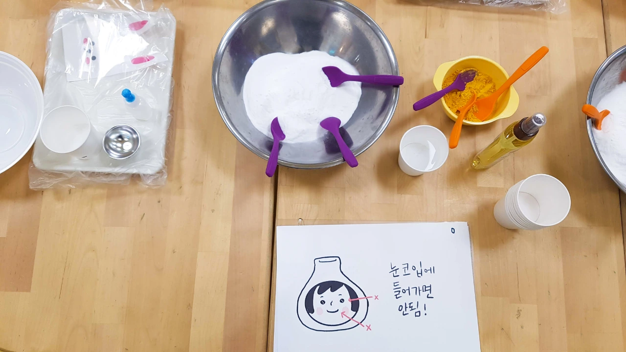 '작가와 함께 하는 아트 클래스'를 진행한 경험은 여러차례 있지만, 이번에는 아이가 다니는 유치원이기도 해서 조금 긴장이 되었습니다. 평소 수업에서 만들기를 자주 하는 것 같았기에, 조금 색다른 재료를 접하게 해주고 싶었습니다. 그래서 '오늘 또 뭐하지?'책에 나온 놀이 중, '입욕제 만들기'를 하기로 했습니다.