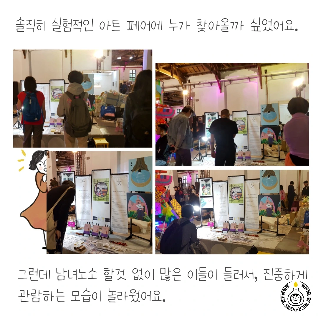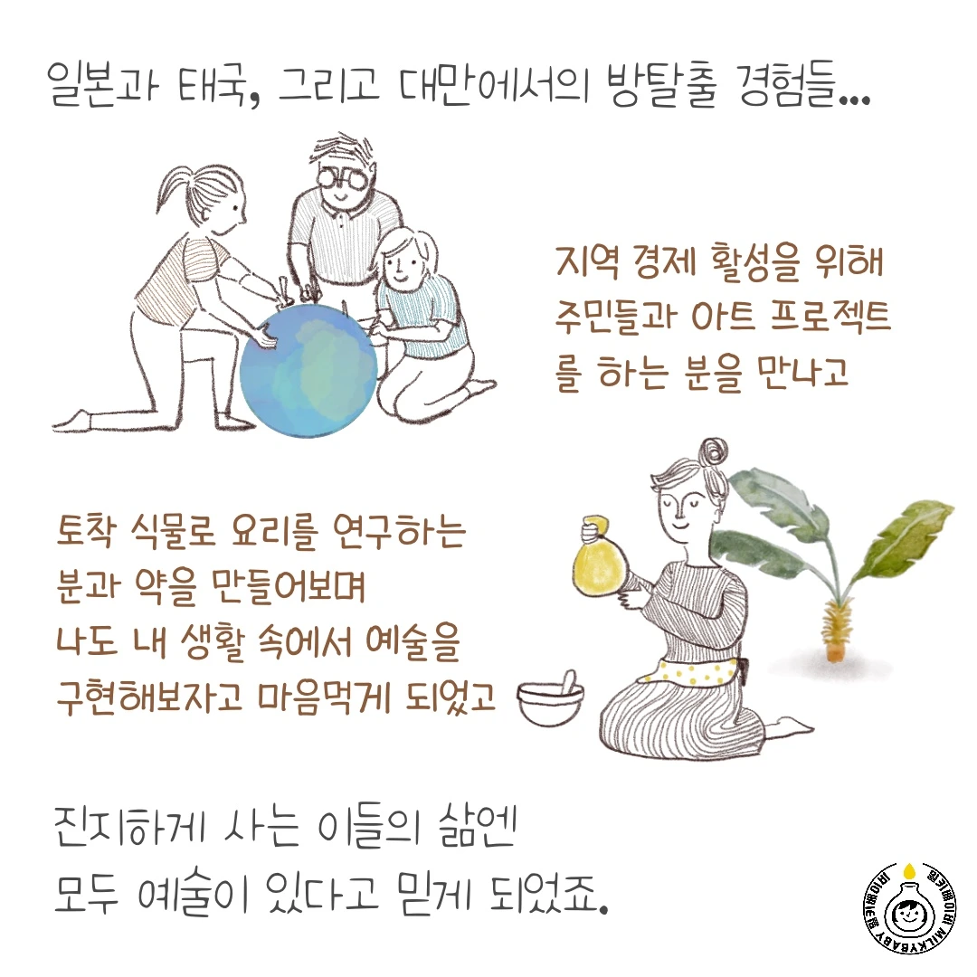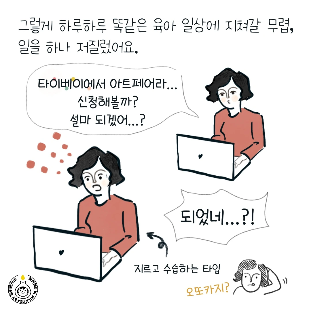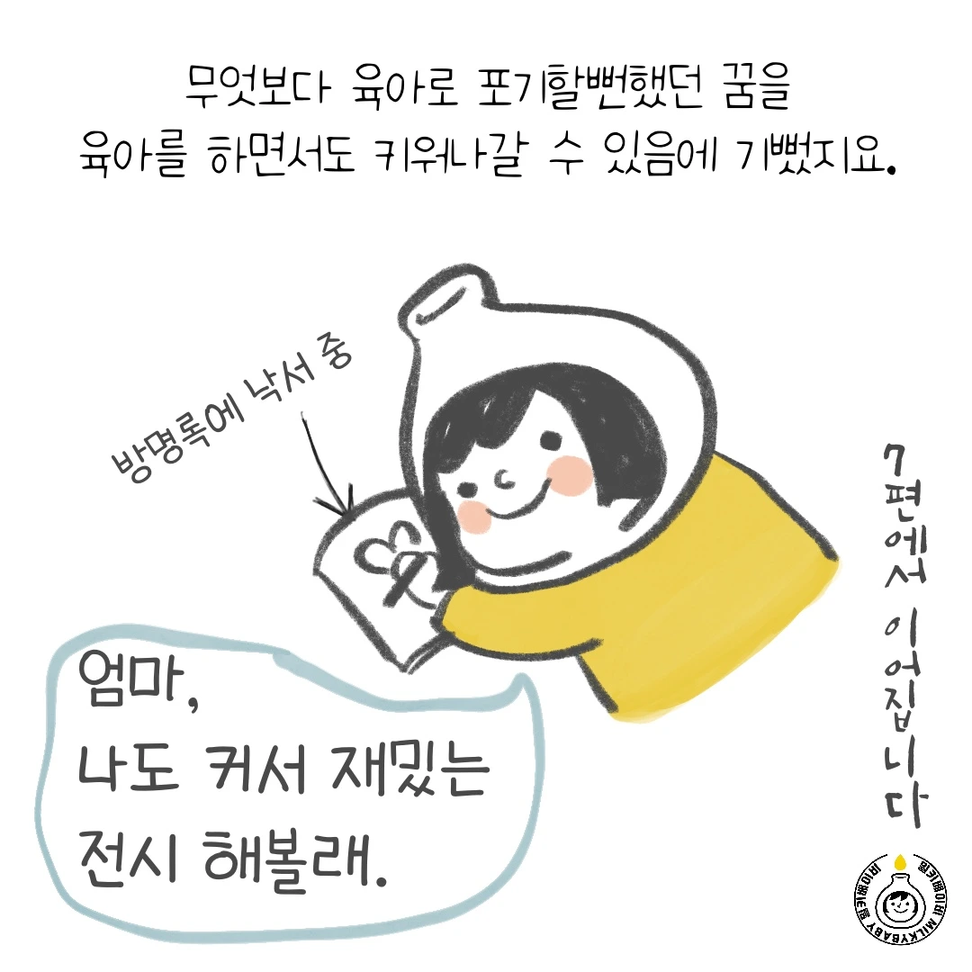 엄마와 일이라는 단어는 서로 많은 것이 상충합니다. 한쪽을 위해 다른 한쪽은 완전히 상실할 수도 있죠. 이런 상황 속에서 '내가 뭐라고...', '아직 준비가 안되었어' 등의 생각이 쉬이 들 수 있어요. 그러나 그런 생각들을 무시하고 작은 도전을 이어갔습니다. 이번 에피소드도 저의 작은 도전 중 하나예요. 그림을 그리는 것도, 이야기를 구성하는 것도, 내 콘텐츠를 알리는 것도 전보다 조금 더 잘하게 되었습니다.