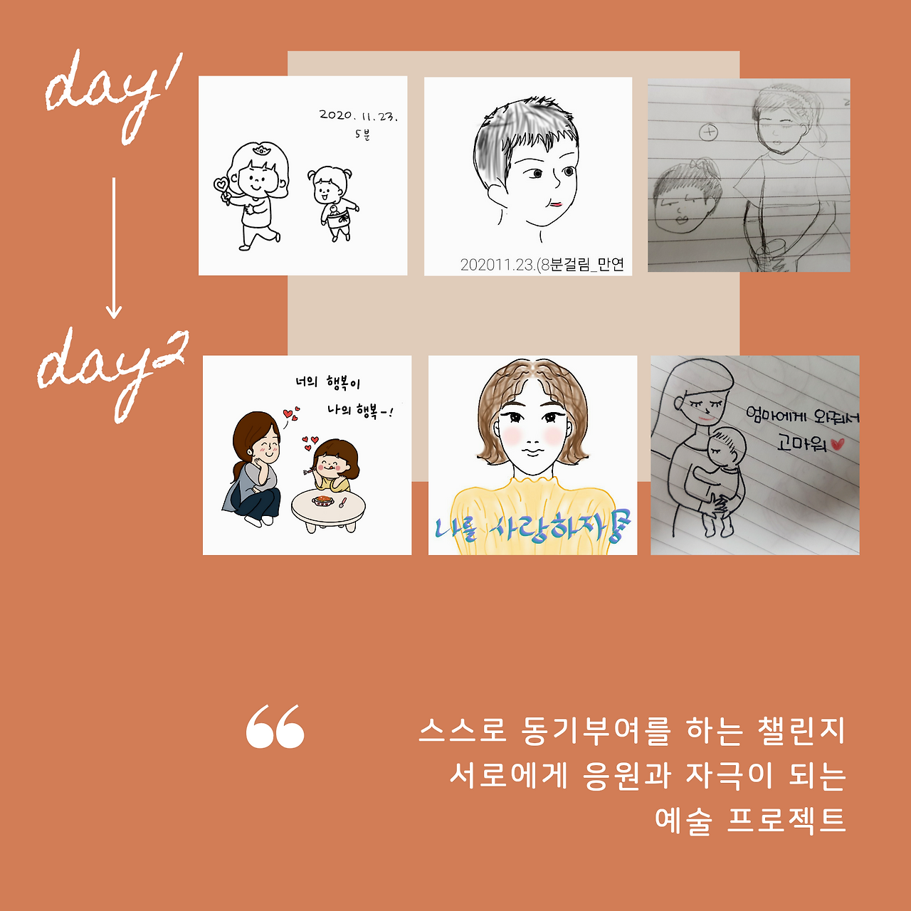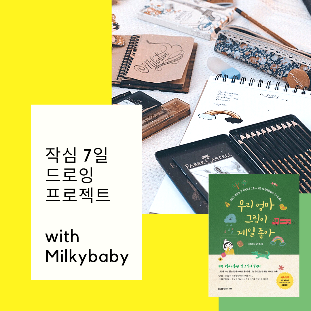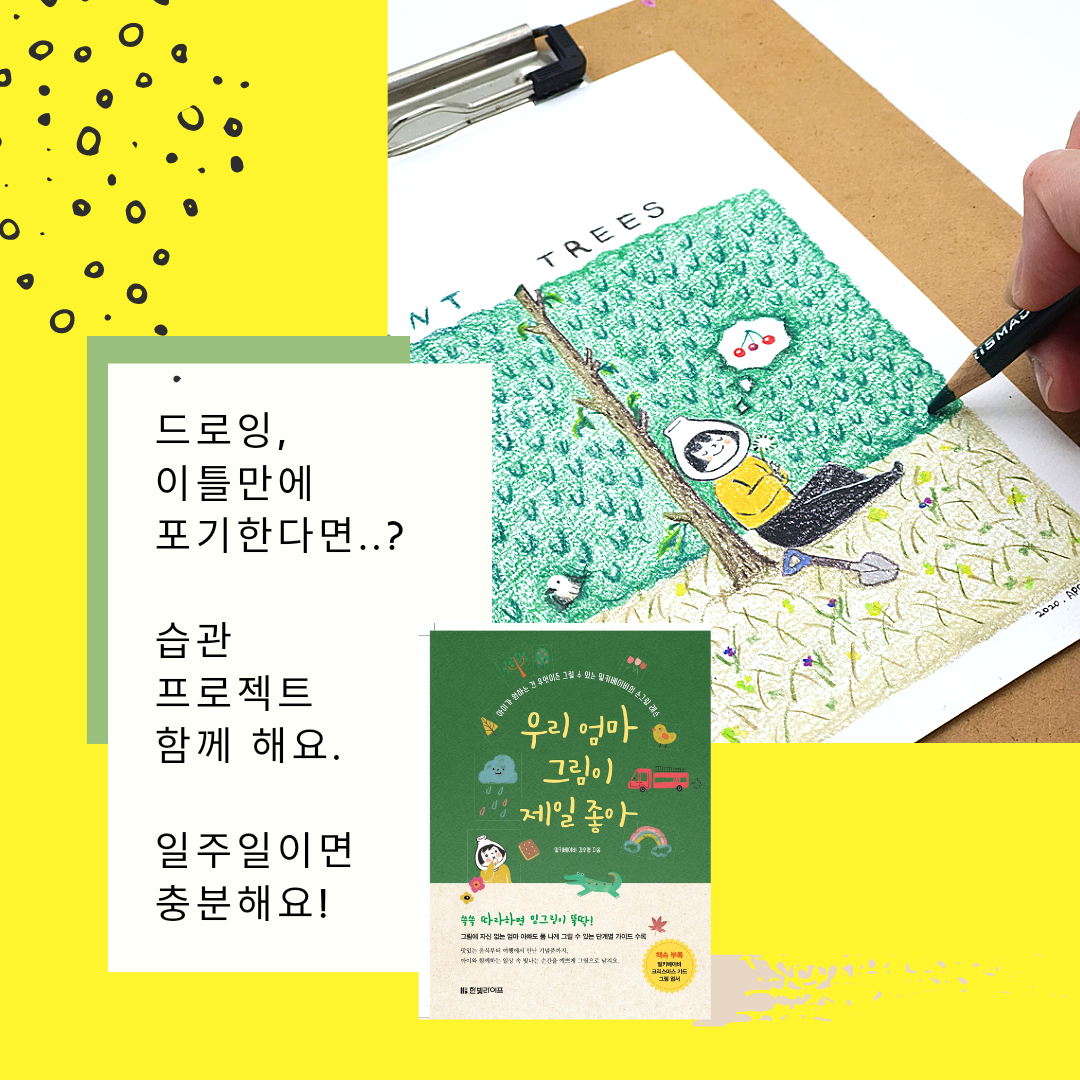 알고 있지만 매번 포기하게 되는 1일 1드로잉! 어디서부터 시작해야 할지, 어떻게 연습해야 할지 등등 많은 분들이 비슷한 고민들을 보내주시곤 했어요. 그래서 #우리엄마그림이제일좋아 출간 1주년 기념 이벤트로 작심 7일 #드로잉프로젝트 를 시작했습니다. 제 저서도 드리고, 저와 함께 드로잉 챌린지를 진행하는 건데 생각보다 많은 분들이 신청해 주셔서 1,2 기로 나눠서 진행 중이에요.