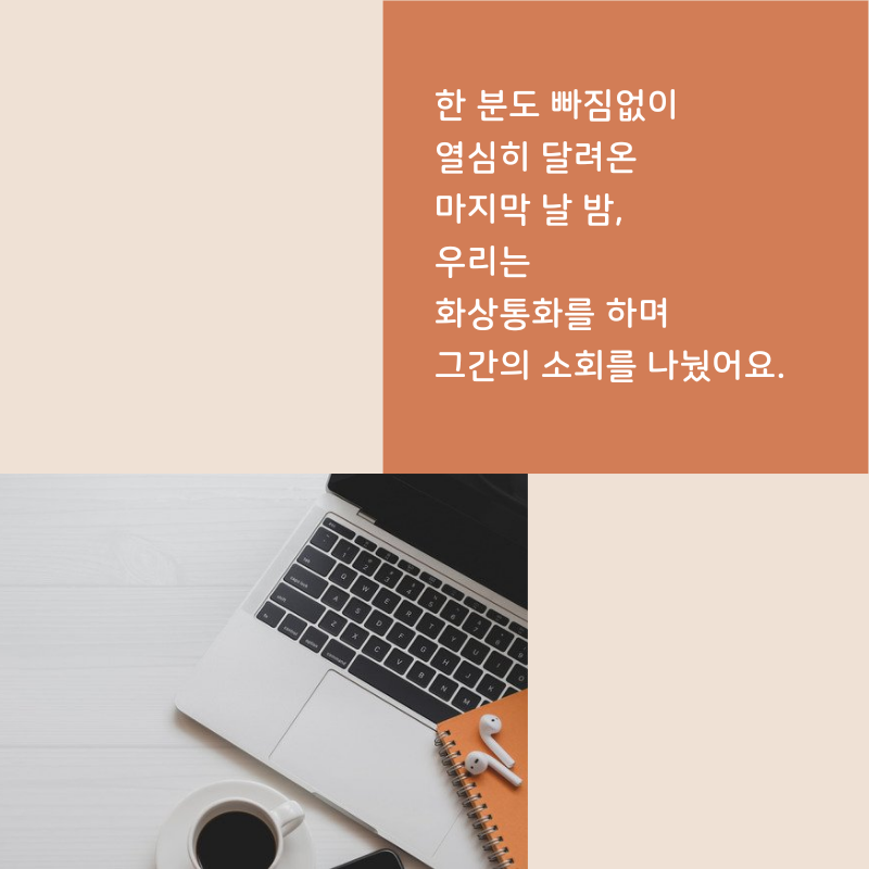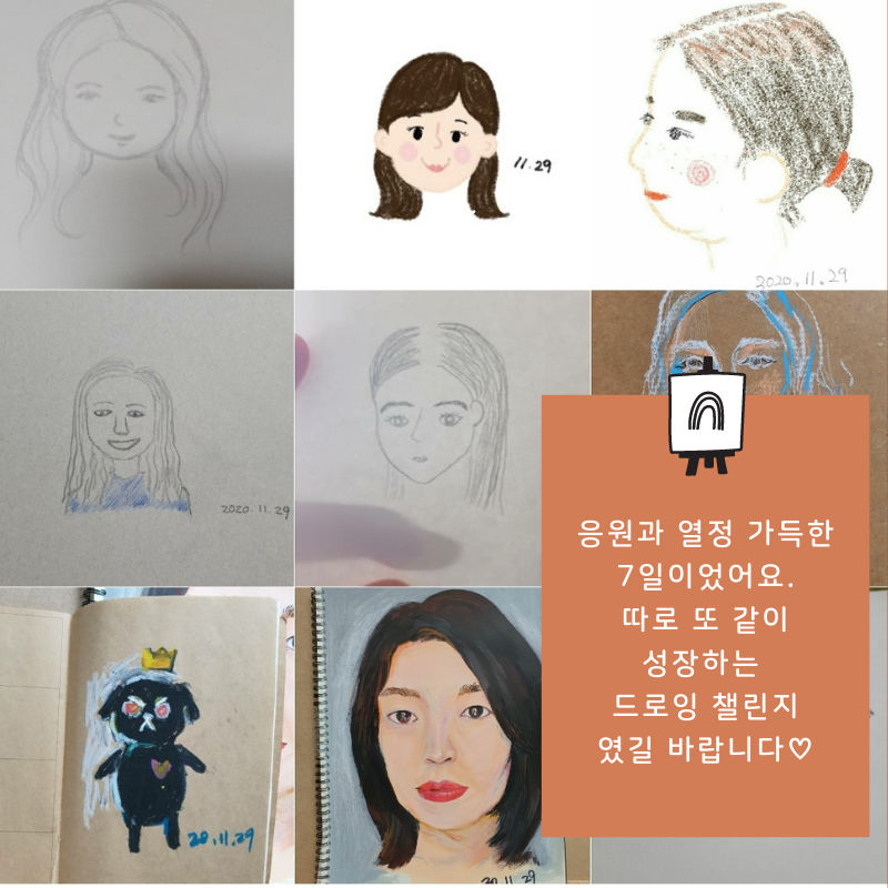 7일간 함께 했던 분들과 화상으로나마 얼굴을 뵙고 이야기 나눴어요. 제가 드린 드로잉 주제를 발전시켜 나가는 모습이 서로에게 많은 자극이 되었고, 평소 드로잉에 대해 고민하시던 것들을 공유해주셔서, '따로 또 같이' 발전해나갈 수 있었습니다. 긍정적인 에너지는 전달되더라고요. 챌린지 기간이 끝나도 계속 드로잉에 대한 열정과 스스로에 대한 응원 이어나가기로 했습니다.