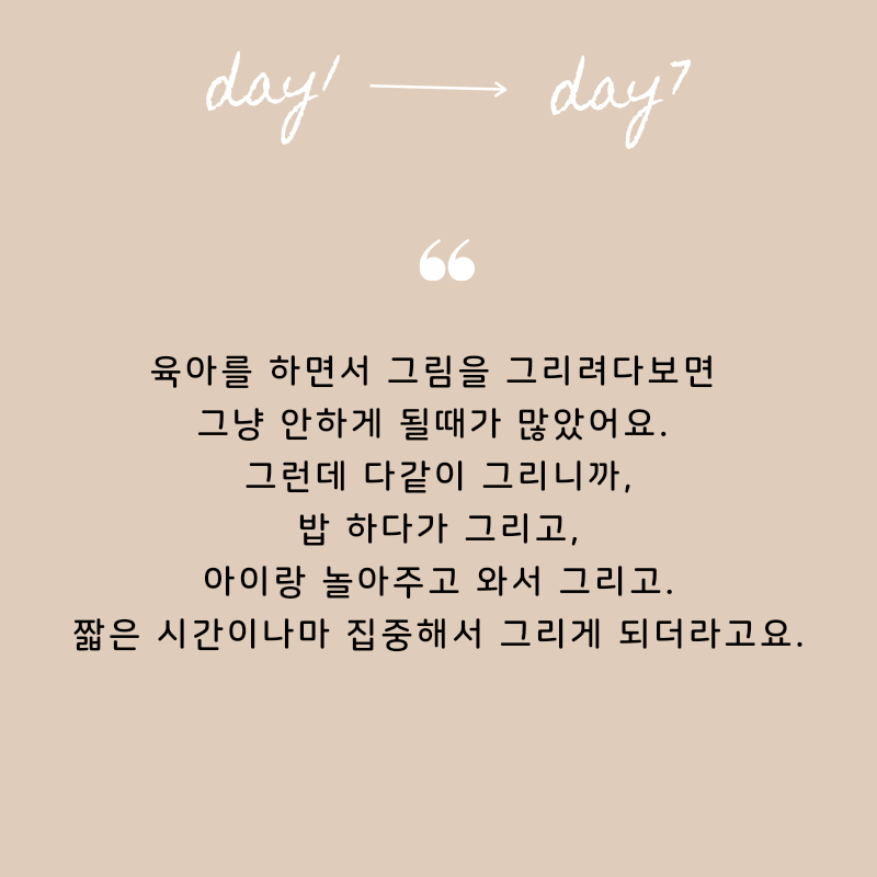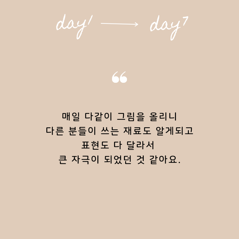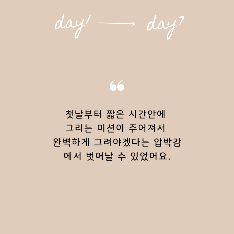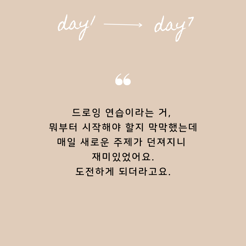 작심 7일에서 눈치채셨겠지만, 일주일간 매일 드로잉을 하는 챌린지입니다. 일주일이면 짧은 것 같지만, 바쁜 일상을 보내면서 드로잉 시간을 따로 마련하는 게 생각보다 쉽지 않아요. 혼자 하면 어렵지만, 같이 하면 쉽습니다.