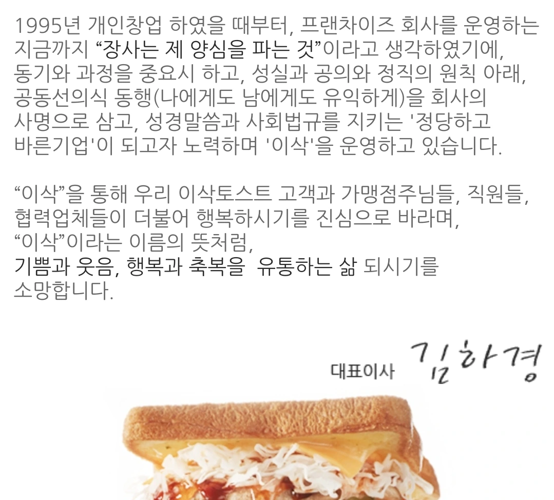 예전에 #이삭토스트 콜라보 제의가 왔을 때, 이삭 홈피에 가 봤어요. 김하경 대표이사님의 인사말을 보고 '뭐지?' 싶었죠. ⠀ 공동선의식 동행 (나에게도 남에게도 유익하게)를 사명으로 삼으시다니... 그동안 제가 알던, 내 이익을 우선시하는 기업들과 너무 달랐어요. 이 분의 옛날 인터뷰, 기사 몽땅 찾아보고 말뿐이 아니라 진짜 기업을 그렇게 운영하시는 대표님이란 걸 알고 콜라보 일러스트, 진짜 잘해보고 싶다는 생각이 들었죠.