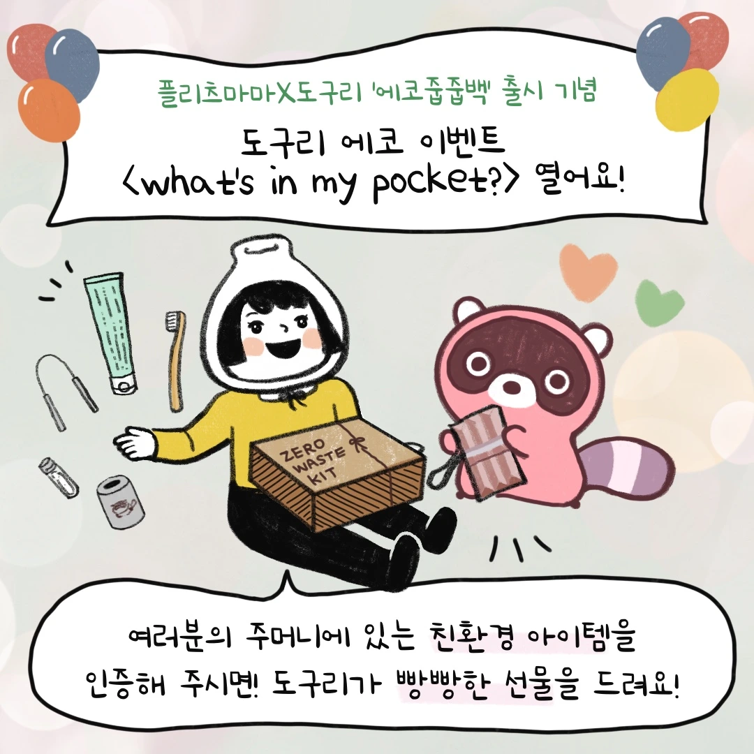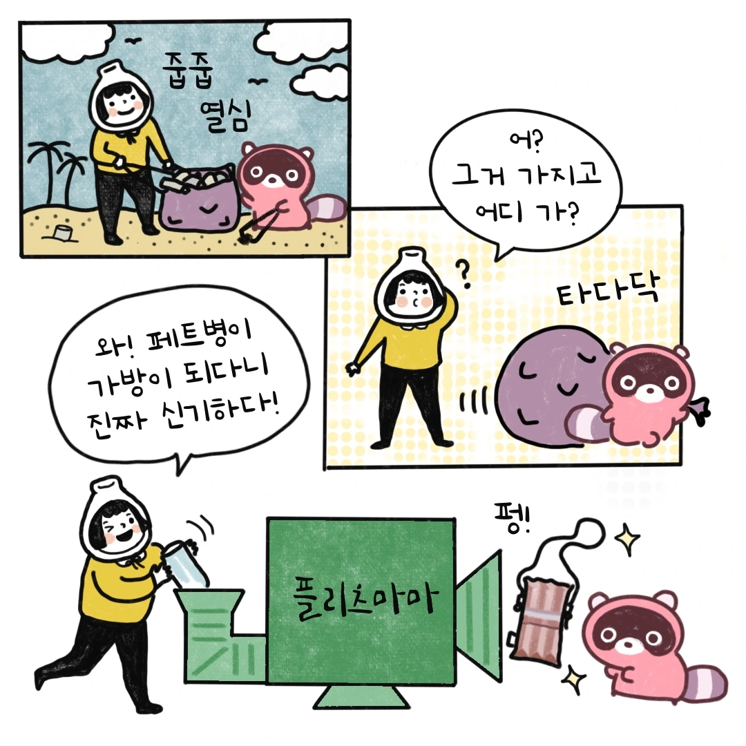 대사 없이 행동으로 표현하는 엔씨소프트의 캐릭터 도구리 특징 살리기 2. 페트병 업사이클 백 브랜드 플리츠마마와 제작한 제품을 증정하는 이벤트