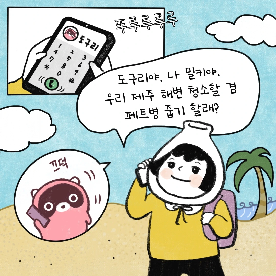 이 두 가지를 '세 컷' 안에 자연스럽게 풀어내는 것에 집중했습니다. 귀여운 두 캐릭터, 밀키와 도구리의 콜라보^^