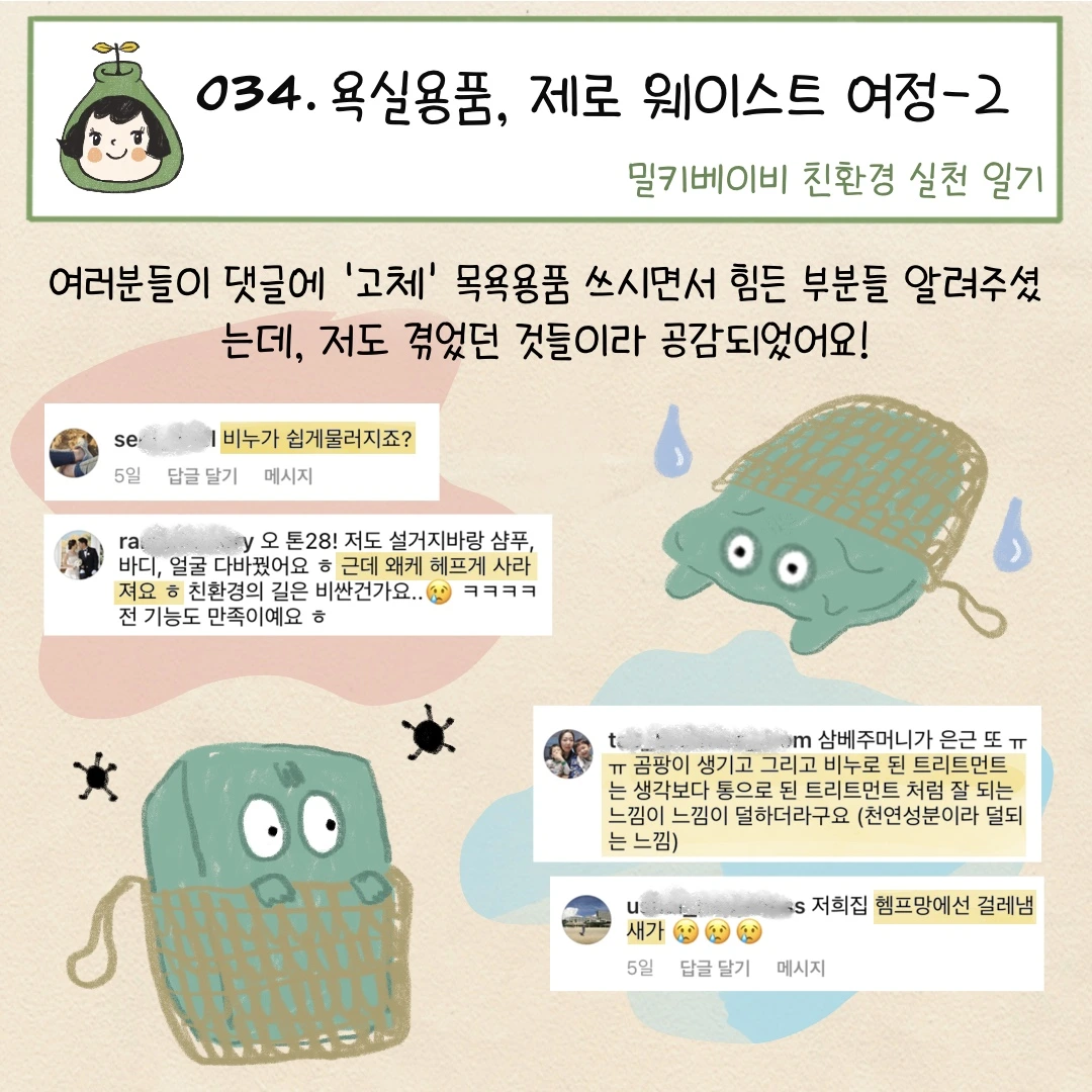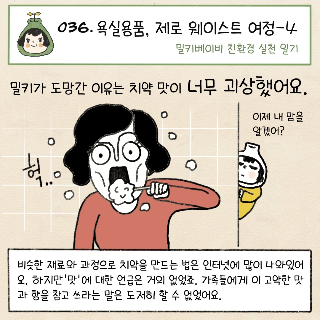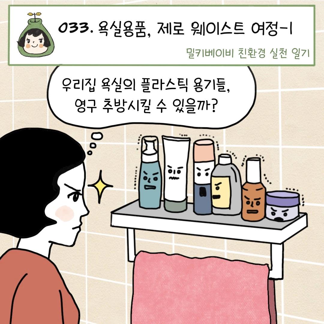 욕실의 플라스틱들을 바꾸며 겪었던 저의 시행착오의 여정을 밀키베이비 웹툰에 담았습니다. 조금이라도 우리 집 플라스틱을 줄이고자 궁리 중인 여러분께 도움 되길 바라며 작업한 첫 번째 제로 웨이스트 에피소드