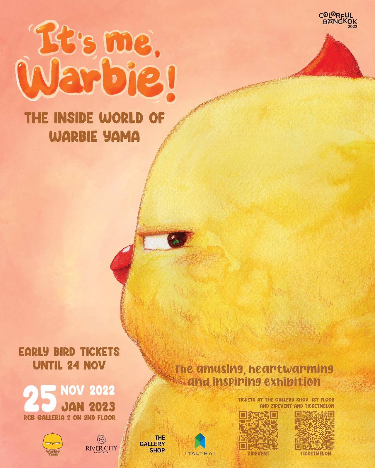 “안녕, 나는 와비야. 방콕 리버시티에서 열리는 The Inside World of Warbie Yama 전시는 2년에 걸쳐 준비한 전시야. 9개 구역에서는 Warbie Yama 세계의 다른 측면을 보여줄 거야. 캐릭터, 애니메이션, 웹툰 등 다채로운 영역을 넘나드는 와비 야마의 전시를 보면 내면의 아이를 재발견하게 될지도 몰라! 다채로운 디자인과 따뜻한 이야기가 담긴 이 전시로 초대해!”