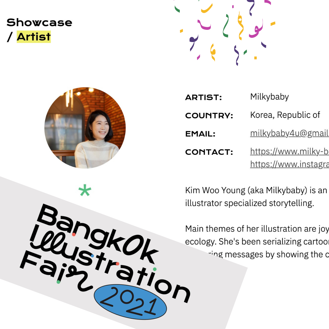 코로나가 한창 기승을 부리던 작년, 방콕 일러스트레이션 페어에 온라인으로 참가하게 되었습니다. 국제적인 이 페어에서 저는 150인의 Selected Artist로 선정이 되었고, 영어로 진행되는 여러 네트워킹에 참여할 수 있었습니다. (https://brunch.co.kr/@milkybaby4u/460) 그중 심사위원 중 하나이자, 에미 상 수상자인 Arut 작가는 이후 저의 멘토가 되어 주었습니다. LA에서 애니메이터로 일하며 얻은, 작업에 대한 조언을 아끼지 않았고, 방콕 리버시티 Rivercity Bangkok에서 열리는 Warbie Yama 와비야마 전시에도 저와 작품으로 콜라보할 수 있게 초대를 해 주었습니다.