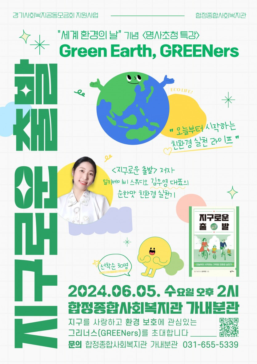 환경에세이툰 '지구로운 출발' 저자 김우영입니다. 이번에 세계 환경의 날을 맞이하여 명사 초청 특강을 갑니다. 저서 '지구로운 출발' 속 친환경 실천을 직접 해보며 얻은 노하우, 실천을 이어갈 수 있는 생각 전환법, 그리고 환경감수성을 늘릴 수 있는 예술 워크숍까지, 지구로운 프로그램으로 여러분을 만나러 갑니다. 장소는 합정종합사회복지관이며, 경기사회복지공동모금회에서 지원하는 2024년 그린열매 나눔사업의 일환으로 진행합니다.
