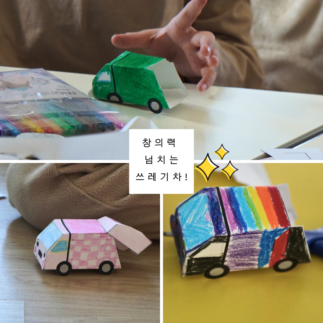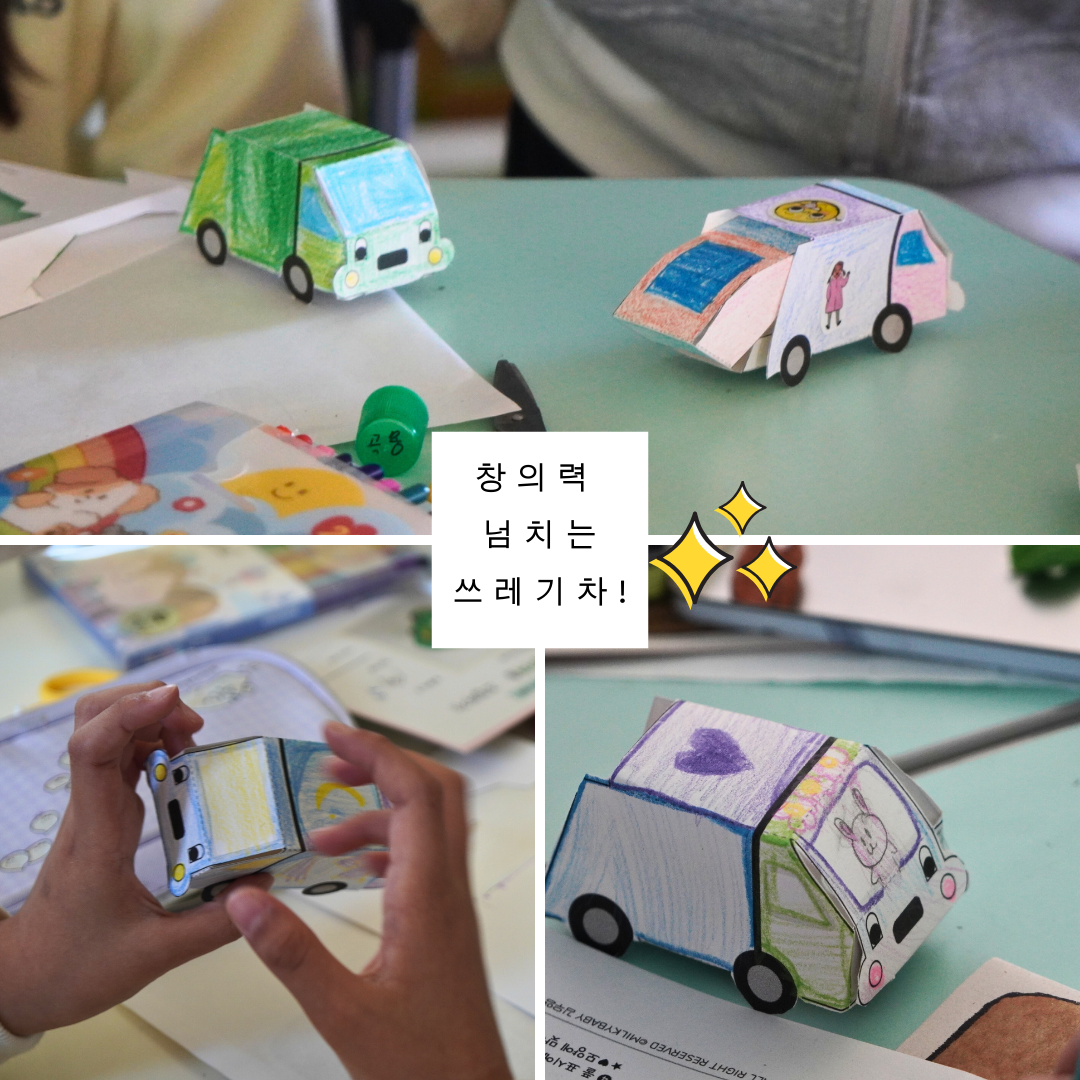 그림책 읽기 및 환경 수업 후에는 친환경 재료를 활용한 '쓰레기차 만들기' 활동을 진행합니다. 수업에서는 우리의 작은 행동이 환경에 미치는 영향(소비)과 그 연쇄작용(쓰레기난)을 이해할 수 있게 합니다. 이후 자신이 만든 쓰레기차를 이용해 소비 절제 챌린지를 해봅니다.