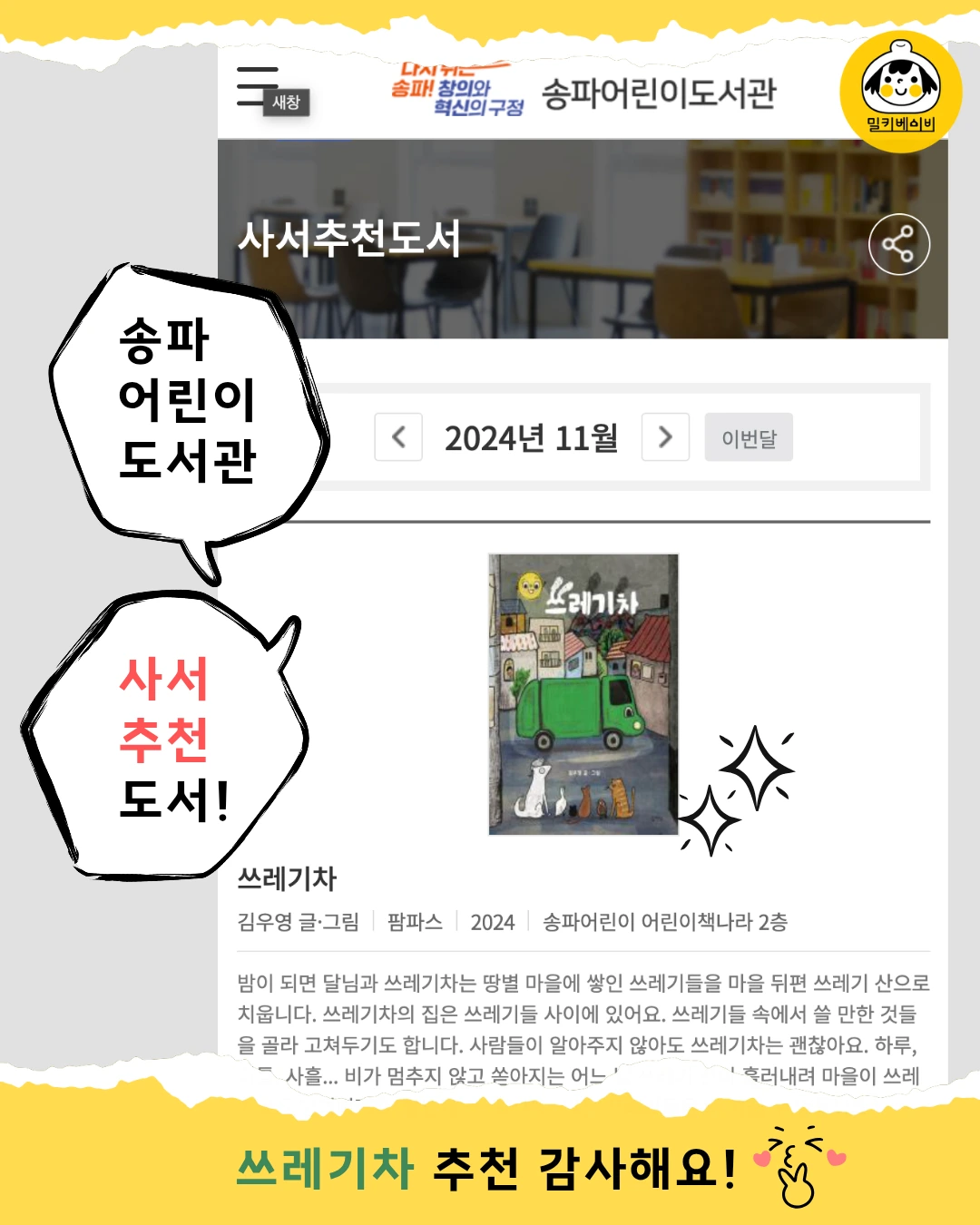 #환경그림책 '쓰레기차'가 송파 어린이 도서관의 사서 추천 도서로 선정되었습니다. 아이들의 눈높이에서 환경 문제를 쉽고 재미있게 풀어낸 '쓰레기차' 그림책은 출간 이후 많은 어린이들에게 사랑받아서 2쇄를 찍었답니다. 실제로 여러 도서관에서 대출 순위가 꾸준히 상승하고 있다고 하니, 더욱 뿌듯한 마음이 듭니다.