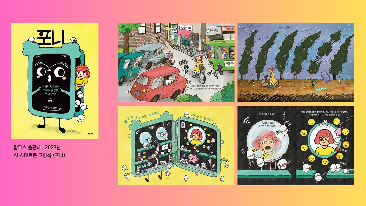 세상에서 제일 똑똑한 스마트폰 '포니'와 사는 주인공 미지. 포니는 뭐든지 척척 알려주고 원하는 걸 찾아주지만, 미지는 점점 스스로 생각하지 않게 됩니다. 귀여운 외모 뒤에 숨은 '알고(리즘)'가 미지의 일상을 조종하고 있었던 거죠. 챗GPT 시대를 살아가는 아이들에게 기술에 휘둘리지 않고 주체적으로 선택하는 법을 알려주는 그림책입니다. 도서관 인기 대출 도서, 사서 추천 도서인 그림책 <포니>는 2쇄를 찍었습니다! 내년에 2권도 준비 중입니다. https://search.shopping.naver.com/book/catalog/43320644619